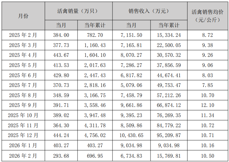 2026年2月份相较于1月份,活禽销量和销售收入均出现下降。销售均价则小幅上涨。上述财务数据均未经审计,可能与公司定期报告披露的数据存在一定差异。