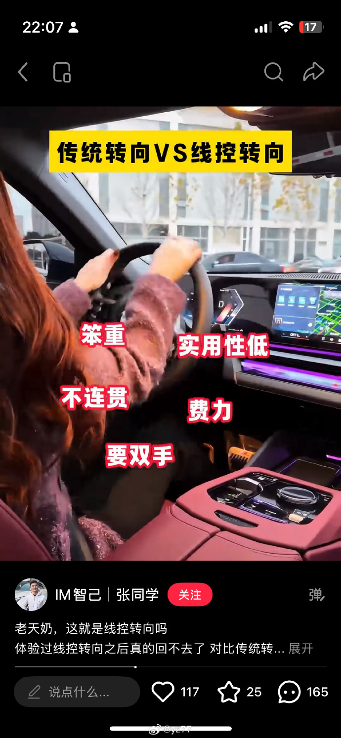 4,线控转向不代表高级,也不是突破性的新技术。去年我跟 BMW 主管驾驶体验的高级副总裁阿尤比博士见面的时候专门聊过这个问题。BMW 很多年前就在研究 SbW,但是到现在也没量产使用,主要就是人车沟通感的丧失,这是 BMW 无法接受的。