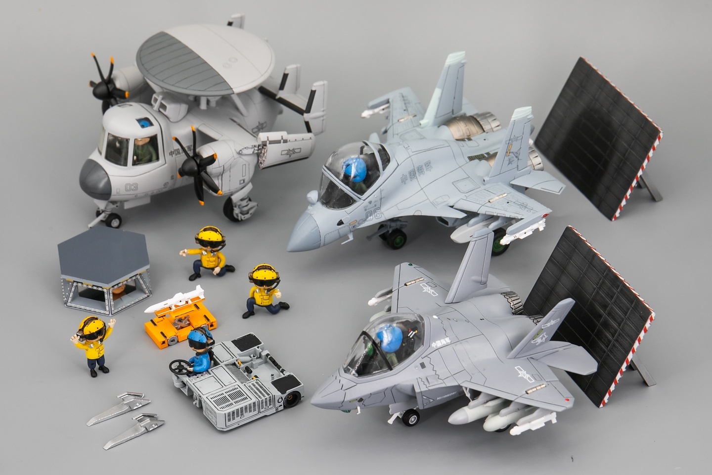 初步攒了一套中国航母地勤装备与人员。设备包括:飞机牵引车、挂弹车、弹射控制站。人