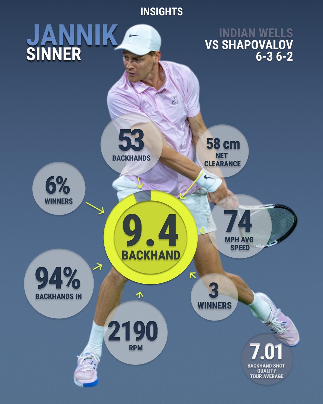 94%的进球率、2190RPM转速、74英里/小时、过网高度58cm、9.4质量分、6%的制胜分得分率。