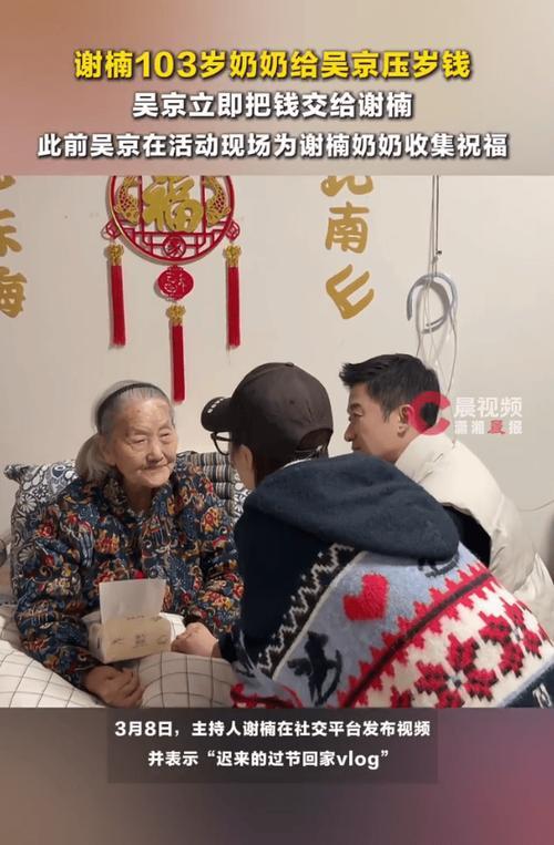 3月8日,谢楠分享探103岁奶奶的vlog,画面暖心。此前吴京合肥路演《镖人》,邀全场为奶奶录祝福。到养老院后,夫妻俩跪地磕头祝寿,奶奶眼不花耳不背,笑得十分开心。她颤巍巍从枕下摸出红包塞给吴京和谢楠,52岁吴京下意识要交妻子,谢楠提醒这是奶奶给他的压岁钱,吴京遂郑重收下,满是温情。
