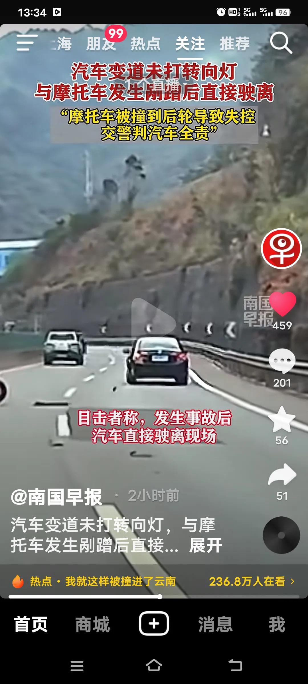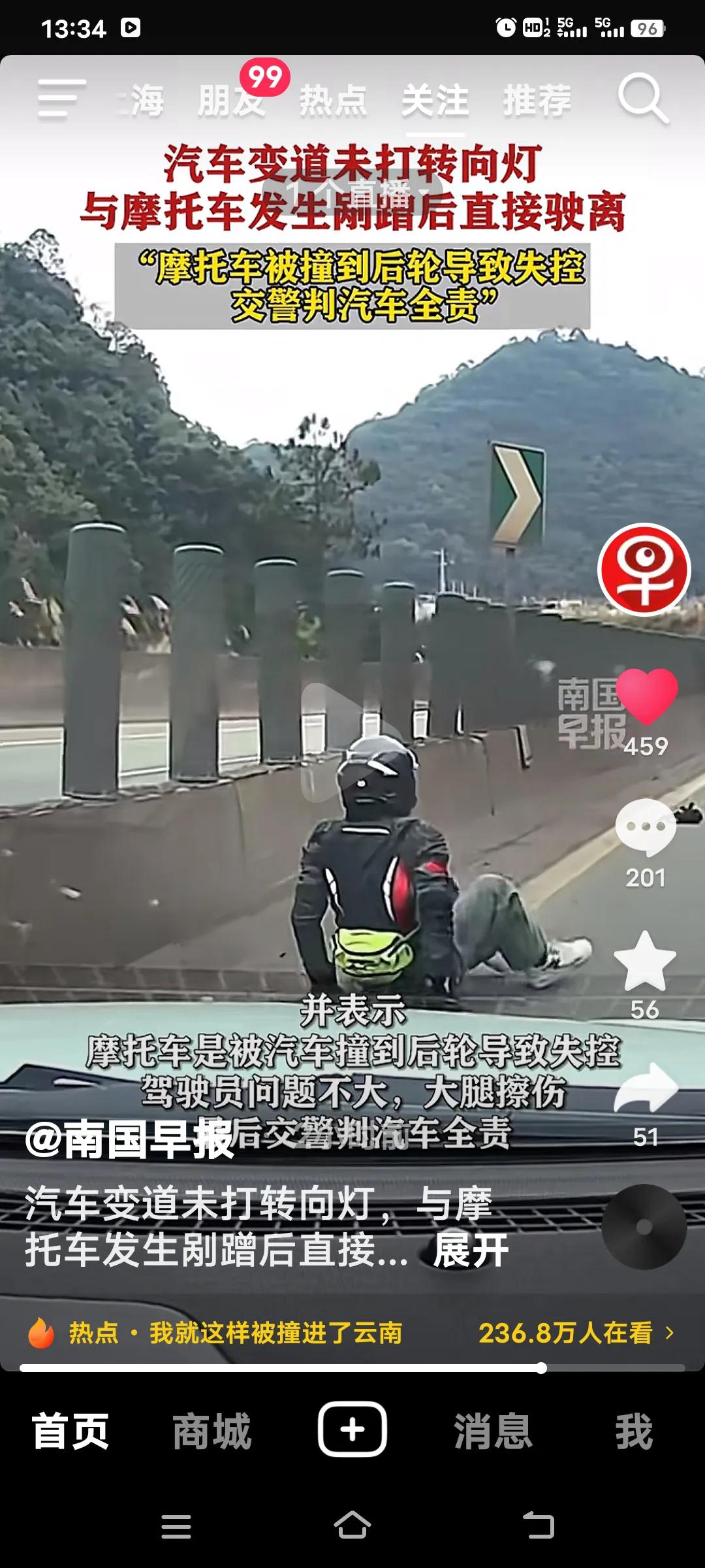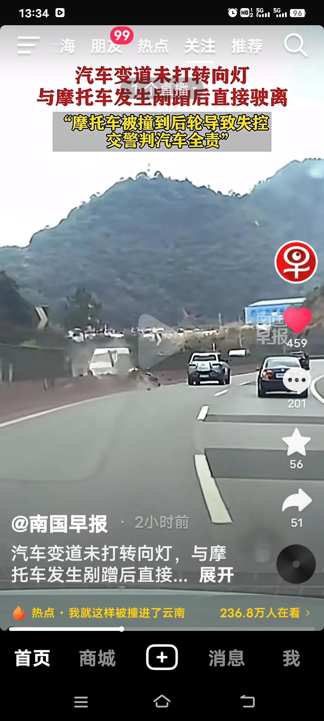云南这起汽车不打转向灯就撞上摩托车的事故,实在是令人无语。 打转向灯是最基本的交通规则,连这都不遵守,不出事才怪。一名骑摩托车的年轻人被撞,摩托车后轮外壳撞得碎片乱飞,好在摩托车主还能坐起来。更可气的是,小车司机视若无睹,直接开车扬长而去!还表示问题不大,就大腿檫伤。实际上,不打转向灯发生事故不一定就负全责,需要综合多方面因素判断。不过在这起事故中,交警判定汽车负全责。 倘若摩托车没有过错,汽车不打转向灯突然撞上去,交警判其全责合情合理。 不打转向灯会让后方和相邻车道的车辆难以预判行车意图,极易引发追尾、碰撞事故。遇到这类事情,双方可以先协商,若有争议可选择调解或诉讼。这也给各位司机提个醒,开车一定要遵守规矩,否则出了事后悔都来不及。 话说回来,骑摩托车尽量别走汽车道,靠边走才是关键,一旦发生碰撞,那无异于鸡蛋碰石头。好在这次事故中没人有生命危险。大家说是不是这个理儿? 云南环东路车祸 个体交通事故