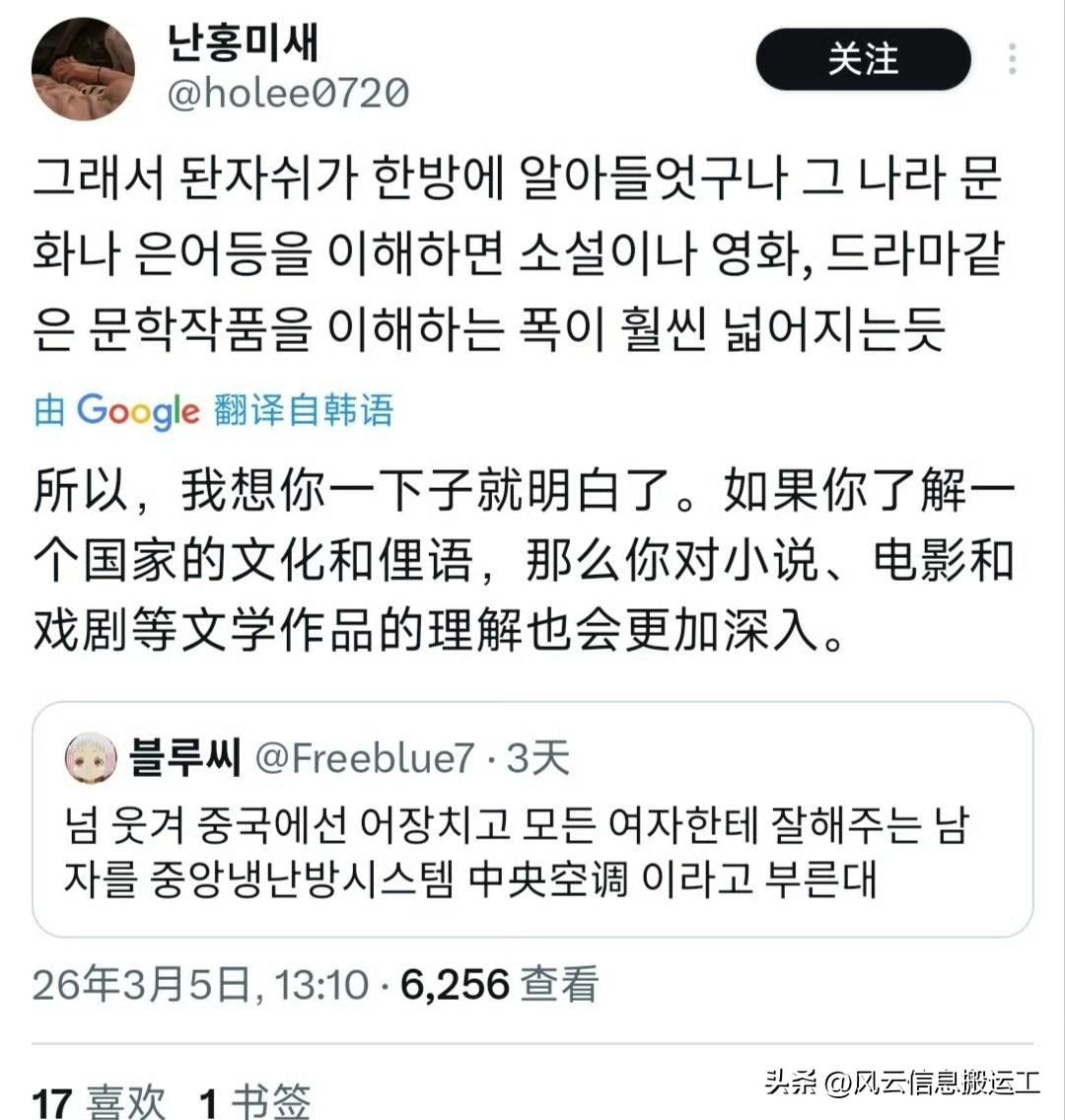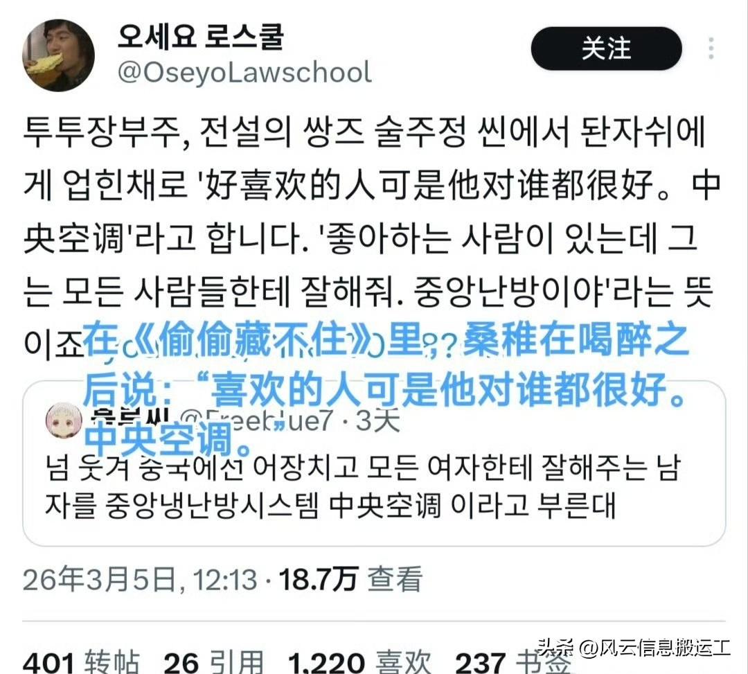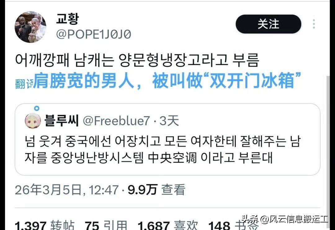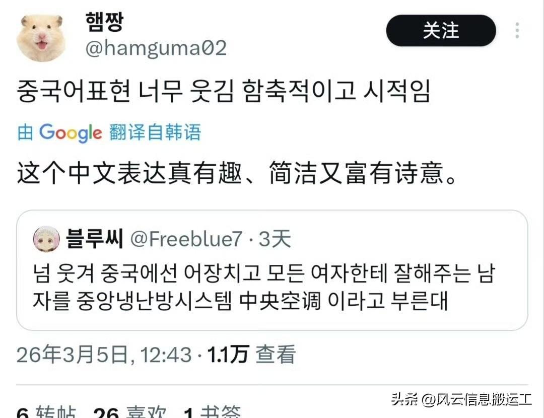 韩国网友看中国电视剧发现,中文的表达有趣简洁又富有诗意,比如对所有女性都好的男人被称为中央空调,肩膀宽的男人被称为双开门冰箱!