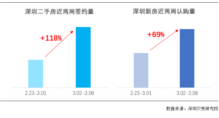 再看看贝壳的数据——上周贝壳深圳合作门店二手房签约量环比增长118%,3月8日单日签约量直接创下近一年新高;同期新房认购量环比增长69%,一二手房成交量连续两周同步走高。