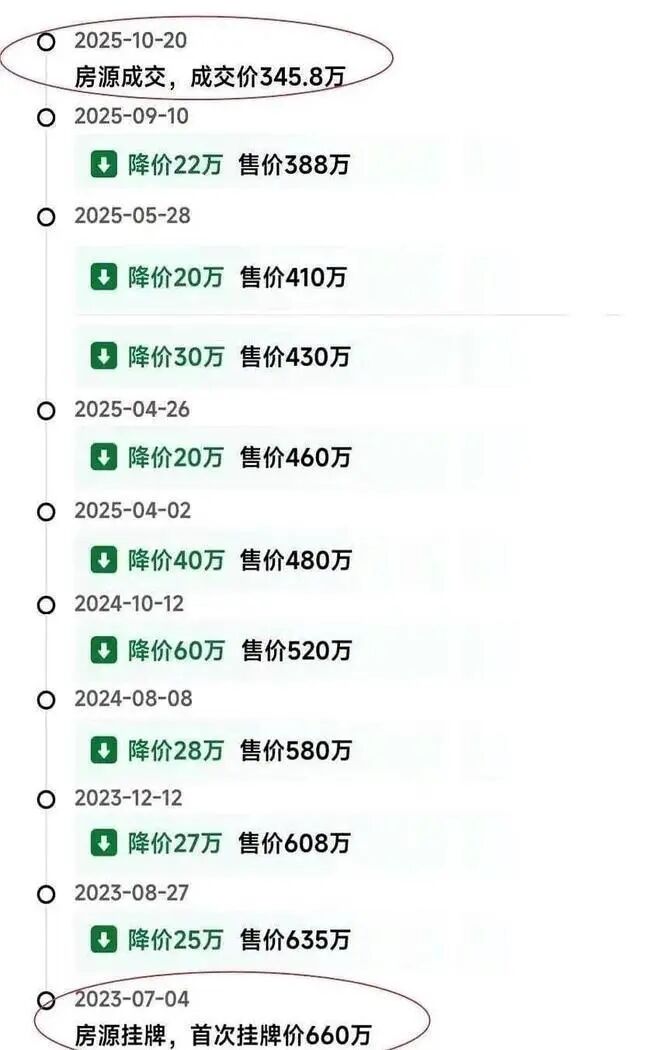 到了2024年10月往后,业主算是彻底慌了。价格从520万开始“跳水”,连400万的关口都没守住。最终成交价定格在345.8万,前后主动降价9次。