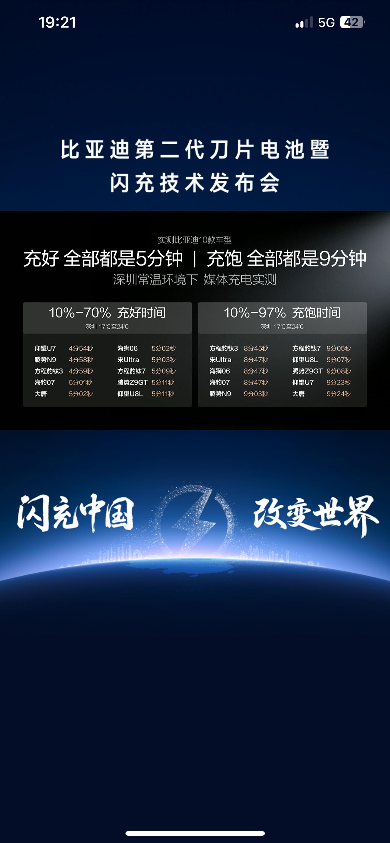 深圳现场直击!比亚迪闪充时代真的来了 深圳发布会现场全程高能!亲眼见证比亚迪第二代刀片电池+闪充技术发布,震撼到失语,硬核闪充技术树立行业新标杆,中国新能源技术直接封神 第二代刀片电池用一组数字重新定义闪充:5分好、9分饱、3分寒 常温10%-97%仅需9分钟,充电快到像加油! 零下30度极寒环境,只多3分钟就能充饱,冬天充电慢、低温拉胯的痛点彻底解决! 更绝的是闪充不妥协安全、续航与寿命,全维度行业顶尖,还有超安心质保,用车安全感拉满 现场官宣「闪充中国」战略太炸了! 全国闪充站快速落地,充电像加油一样便捷,补能焦虑彻底拜拜~ 车主还能享一年免费闪充,比亚迪这波诚意直接拉满! 这场发布会不仅是技术革命,更是新能源电动化上半场的完美收官! 在现场真切感受到中国技术引领世界,身为中国人狠狠自豪🇨🇳 闪充时代,真的来了!【来自懂车帝车友圈】