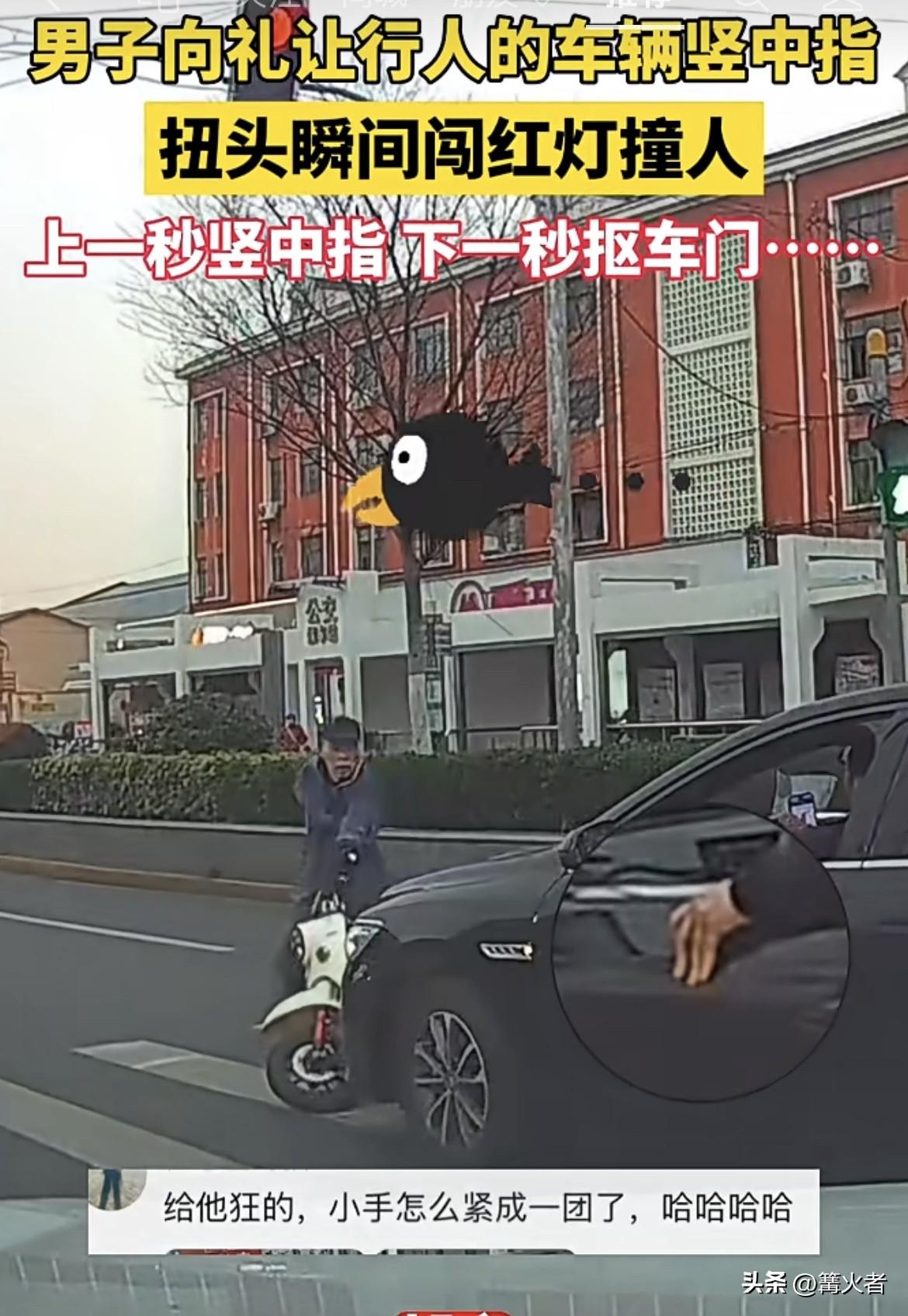 女司机在斑马线前停车礼让行人,可后面黑车司机倒好,觉得“堵路”,疯狂鸣笛、强行变道超车,还对女司机竖中指、骂骂咧咧,结果乐极生悲,这司机光顾着发泄,没留意前方斑马线,直接撞上骑电动车的大爷。还好车速慢,大爷反应快跳车,没受伤,就是车有点损伤。