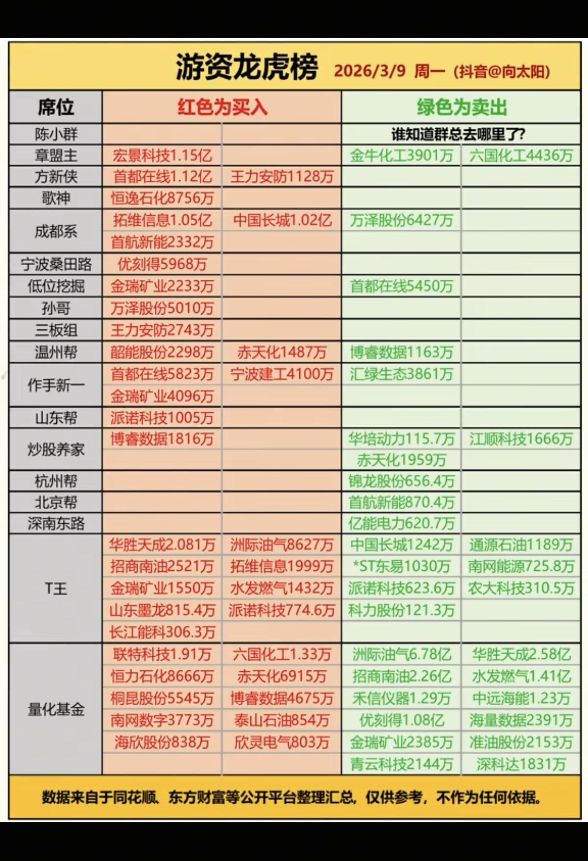 3.9周一 看看游资大佬们都买了啥? 龙虎榜数据! 首都在线、顺钠股份、南网能源等获得多家游资抢筹。 抢筹焦点:油气开采,算力,数据中心
