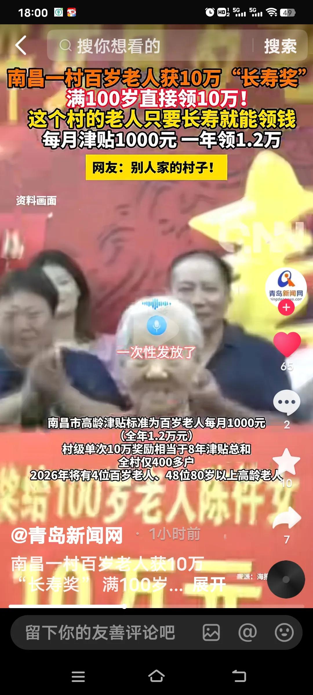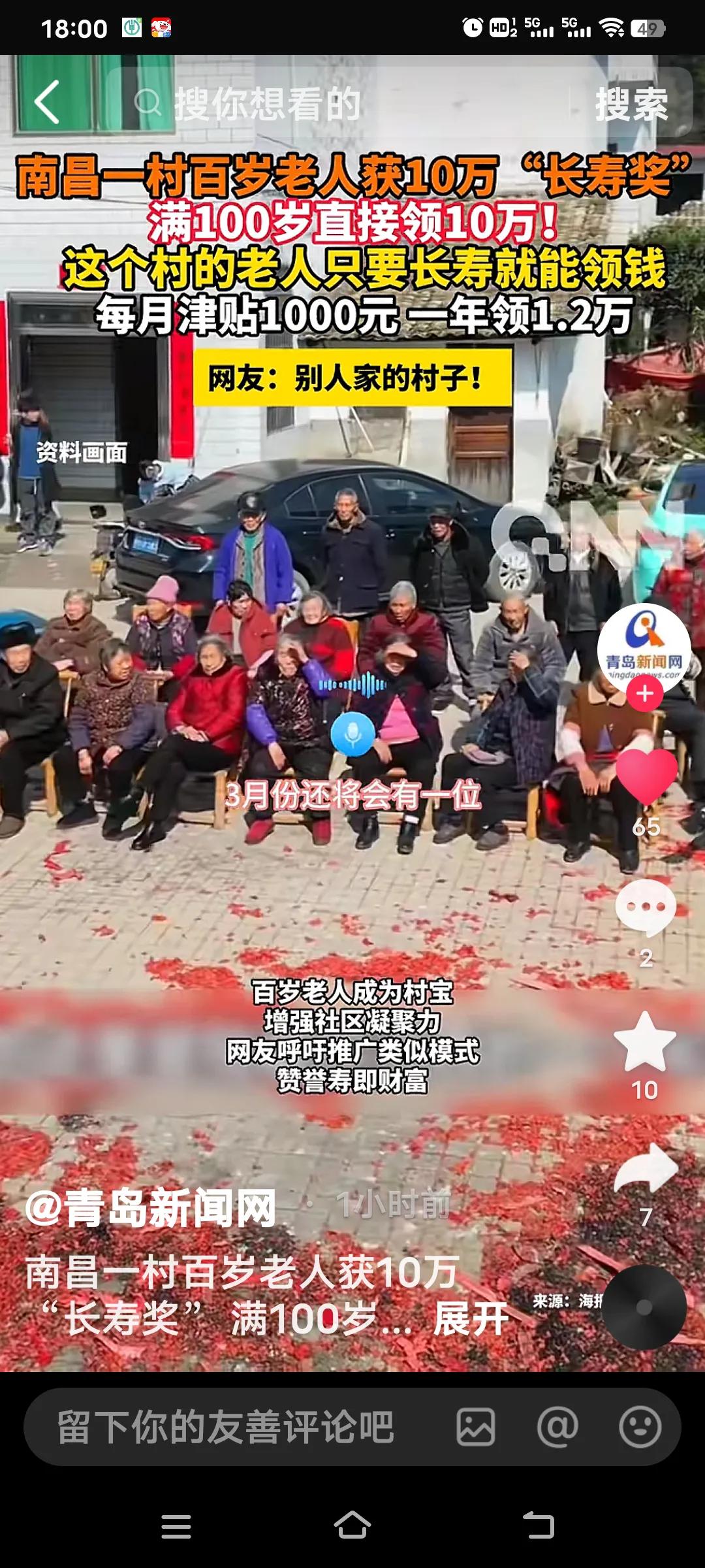 南昌青山湖区进顺村真是太暖心了!这个村只要老人长寿就能领到老人补贴一个月1000块钱,一年1.2万元。3月7日,村里首位百岁老人,村委会工作人员上门送了10万奖励金。这位老人精神矍铄,还能做针线活,拿到钱直说“这十万块可耐用咯”。 进顺村虽是只有400多户的“城中村”,却有48位80岁以上老人。村里早有高龄老人奖励政策,“满百岁奖励十万”很是亮眼。今年预计还有两位老人满百岁。这不仅体现村集体对老人的关爱,也说明村集体经济发展得好,让村民共享成果。 这真是对老人的百般照顾了,年龄大的也不要拖累子女,上级领导会安排,而且这位百岁老人还能织毛衣,聪慧的很,她也知道钱银 耐用。但是有的地方并没有这种操作呀!南昌老年福利 南昌高龄补贴 南昌永溪村