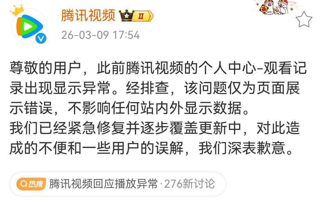 青天大老爷🤲🏻终于有人替我们说句话了,🐧回复得挺直接,就说是个人中心观看记录页面显示异常,而且“不影响任何站内外显示数据”,问题已经修了!悬着的心终于能放下来了…逐玉剧情就是从种田文开始的,是个逐步递进的过程,长剧的魅力不就在于对人物关系的铺垫吗,不能说因为觉得种田剧情恬淡没有那些大开大合的下沉梗就说假爆吧🥲而且我杀猪养你,爆改七步诗已经很出圈了捏!爱逐玉恨逐玉都先来🐧看看逐玉!腾讯视频回应播放异常
