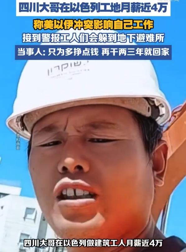 要有命花的才是钱,一四川男子,在以色列工地打工,月薪近 40000 元,而且是一月一发,每月 20 几号就发工资,从不拖欠。战火纷飞虽然影响到他的工作,但警报一响,他和工人们就撒丫子就跑,躲到地下避难所,他说啥都舍不得放弃高薪工作回国,打算再坚持干 2-3 年,就回家老婆孩子热炕头。   深夜十点,以色列工地工棚里,唐大哥就着冷水,啃着干硬的冷馍。   棚外隐约传来爆炸声,他却摸出手机,看着家里的照片红了眼眶。   “再扛两年,等娃上高中,爹妈能安心养老,我就回家。”他喃喃自语。   没人能想到,这个月薪近4万的四川汉子,日子过得比谁都苦。   唐大哥今年41岁,来自四川一个偏远山村,家里条件一直不好。   父亲前年中风偏瘫,常年卧床需要人照顾,母亲也有严重的关节炎。   儿子上初中,正是花钱的时候,妻子守着家里,连件新衣服都舍不得买。   作为家里唯一的顶梁柱,他知道,自己不能停,更不能倒下。   来以色列之前,他在国内跑过外卖、搬过货物,最后还是扎根工地。   最难的时候,他一天打两份工,白天在工地搬砖,晚上去夜市帮工。   哪怕拼尽全力,一个月也只能挣八千多,连父亲的药费都不够。   有一次,父亲病情加重住院,他凑不齐押金,急得在医院走廊哭。   那一刻,他就发誓,只要能多挣钱,再苦再危险的活,他都愿意干。   2025年冬天,老乡从以色列回来,说那边工地招工,月薪近4万。   老乡还说,当地有战火,但只要反应快,就能避开危险。   唐大哥没多想,当天就报名,连跟家人好好告别都没来得及。   坐了十几个小时的飞机,再转几趟车,终于到了以色列的工地。   刚到工地第一天,他就傻了眼,这里的条件,比他想象中还差。   工棚是临时搭建的,四面漏风,晚上睡觉能听到外面的风声。   没有热水,只能用冷水洗漱,衣服脏了只能自己手洗,晾干后满是褶皱。   工地上没有四川菜,每天都是面包、土豆,他吃不惯,却从不敢浪费。   为了省钱,他从不买零食,甚至连一杯热饮都舍不得喝,渴了就喝冷水。   每天上工,他都是第一个到,最后一个走,拼命干,不敢有丝毫偷懒。   比起干活的辛苦,更让他煎熬的,是随时可能到来的战火威胁。   如今当地的防空警报越来越频繁,有时一天能响三四次,毫无规律可言。   不管是正在绑扎钢筋,还是吃饭休息,只要警报声响起,他就立刻停手。   来不及多想,跟着工友们疯跑,朝着附近的山洞避难所冲去,不敢有半分停留。   奔跑中,耳边是刺耳的警报声,偶尔还能听到远处的轰鸣声,心提到了嗓子眼。   好几次,他跑得太急,脚下打滑差点摔倒,却也不敢放慢脚步,只想快点避险。   身边的工友有人吓得哭了,他却强装镇定,安慰大家别害怕。   其实他心里也怕,怕自己出事,怕家里的老小没人照顾。   可一想到家里的父亲需要吃药,儿子需要学费,他就只能咬牙坚持。   每月20几号,是他最开心的日子,因为这一天,工资会准时到账。   他从不会拖延,工资到账的第一时间,就把大部分钱寄回家里。   只留几百块生活费,够买面包和水,就足够了。   他很少给家里打视频,大多时候是发语音,怕家人看到他的狼狈。   每次发语音,他都笑着说自己吃得好、住得好,工地上很安全。   可只有他自己知道,他常常饿着肚子干活,常常在恐惧中入眠。   妻子每次都在语音里叮嘱他,注意安全,别太拼命,钱够花就行。   儿子也会给她发消息,说想念爸爸,盼着爸爸早点回家。   每次看到这些消息,他都忍不住掉眼泪,心里满是愧疚。   为了多挣点钱,他主动申请加班,哪怕每天只睡四个小时,也心甘情愿。   他还跟着工友学了简单的避险技巧,知道哪里最安全,怎么快速躲避。   他说,自己必须好好活着,活着才能挣钱,才能守护好家人。   工地上的日子,枯燥、辛苦又危险,可他从未有过放弃的念头。   他把对家人的思念,都化作了干活的动力,每多干一天,就离回家更近一步。   如今,唐大哥依旧坚守在工地上,每天重复着辛苦的劳作,警惕着战火的到来。   身边的工友换了一批又一批,有人离开,有人新来,他却始终坚守。   他每天都会关注当地的局势,牢记使馆的提醒,保护好自己。   他不奢求大富大贵,只希望家人平安健康,一家团圆,就足够了。   这份朴素的期盼,支撑着他在战火中吃苦受累,从不抱怨,从不退缩。   他不是英雄,只是一个普通的男人,一个有担当的丈夫和父亲。   愿他能平平安安,早日挣够钱,回到家人身边,不负所有辛苦与坚守。   信源:大河报——四川大哥在以色列工地月薪近4万,称美以伊冲突影响自己工作,打算再...