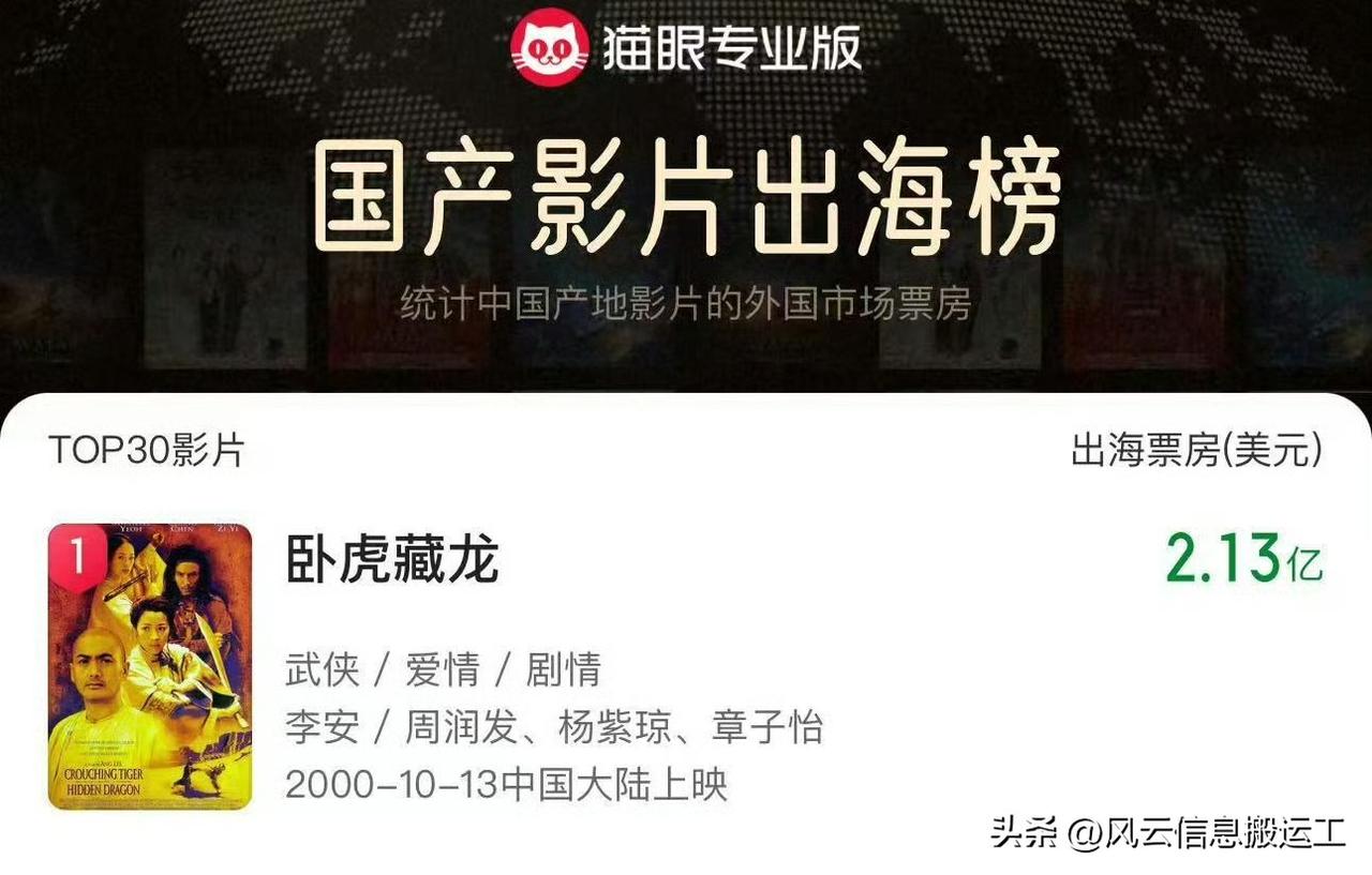 镖人升至全球武侠片票房亚军 冠军是《卧虎藏龙》。该片于2000年上映,在全球共收获了2.14亿美元,稳坐全球武侠电影票房冠军位置长达二十多年之久。 而《镖人》大概率会终结《卧虎藏龙》的冠军,因为相差不多了。 而且在《镖人》问世之前,我们的国产武侠片已经沉寂了好多年。未来我希望国产武侠片能火起来,国产仙侠、玄幻、科幻片都能有制作。