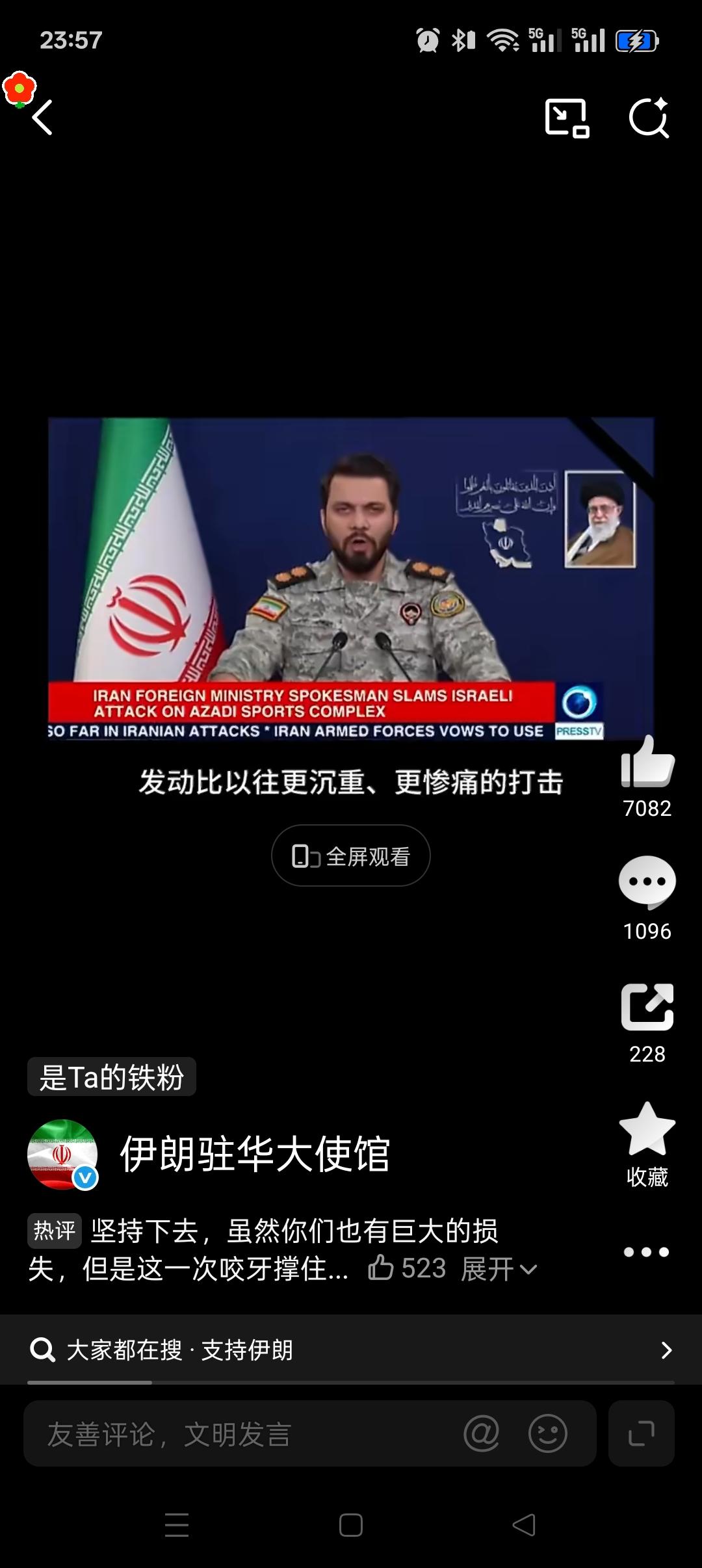 伊朗军方重磅发声!3月8日最新警告,字字铿锵 3月8日09:12,伊朗驻华大使馆发布军方发言人最新讲话,配视频公开表态,信息量拉满! 原话如下: “任何对伊朗发动侵略的源头,都是合法打击目标。 那些没有向美以提供场地与设施的国家,过去不会,将来也不会成为打击对象。 但所有对伊朗实施侵略的基地,都将遭到打击。” 伊朗今天说的这些话,不是虚张声势,是给美以划下的红线,也是给全世界一个明确的态度——我不惹事,但绝对不怕事,谁要是敢侵略我,我就敢直接打回去,而且绝不手软。 就在伊朗发布这个警告的前几天,也就是3月6日,伊朗伊斯兰革命卫队已经开展了“真实承诺4”第22轮军事行动,直接用无人机和精确导弹,打击了美国在中东的多个军事基地,而且打得特别准,一点都不拖泥带水。 其中美军在阿联酋的宰夫拉空军基地,预警雷达被彻底摧毁,存放和维修MQ-9无人机、U-2侦察机的机库也被炸了。 伊朗之所以打这个基地,就是因为这个基地是美军袭击伊朗的重要据点,之前伊朗米纳卜市一所小学遭到袭击。 除了宰夫拉空军基地,美军在科威特的阿里·萨利姆空军基地也被伊朗打击了,预警雷达、附属设施、飞机燃料库,还有两条机场跑道,全被摧毁了,整个地区都能看到基地燃起的浓烟。 要知道自本轮美以针对伊朗的侵袭开始,美军的飞机就是从这个基地起飞,往伊朗领土扔导弹、投炸弹,伊朗这次反击,就是精准打击有仇必报,一点都不含糊。 另外从3月5日晚上到6日,伊朗还分两轮攻击,彻底摧毁了美国在卡塔尔的乌代德空军基地,美军在中东的军事部署直接被打乱。 这就是伊朗的实力和态度。而且更关键的是,伊朗的打击特别精准,只打侵略相关的设施,不伤害无辜。 这也正好呼应了他们发言人说的“不针对没有提供场地与设施的国家”,做事有分寸有底线,但对敌人,只有强硬。 就在3月9日,伊朗又发起了高强度打击,直接用重型弹道导弹,突破了以色列的多层防空拦截,精准摧毁了以色列的海法炼油厂。 这个炼油厂一被摧毁,以军的战争机器直接濒临停摆,空军战机大规模停飞,装甲部队没法机动,战略燃油储备只能支撑一周,而且抢修至少需要四个月,短期内根本没法恢复。 可以说伊朗这些年一直被美以围堵、打压忍了很久了,现在的反击就是被逼到绝境后的正当自卫,是忍无可忍后的绝地反击。 我一直说霸权主义从来都不会讲道理,你越软弱,他就越欺负你;你越强硬,他就越不敢轻举妄动。 伊朗今天的做法,就是最好的例子。他们没有低头,没有妥协而是用自己的实力,捍卫自己的主权和尊严,告诉美以,伊朗不是软柿子,不是谁都能捏的。 而且伊朗的警告,还有一层意思,就是给那些想要帮美以的国家提个醒: 别跟着美以瞎混,别给美以提供场地、设施,否则,就算你不是直接侵略伊朗,也会被当成打击目标;但如果你保持中立,不帮美以,伊朗绝对不会牵连你。 我还想说一点,伊朗今天的做法,不仅是在捍卫自己的主权,也是在给全世界被霸权压迫的国家树立一个榜样。 面对霸权不能低头,不能妥协,只有敢于反抗,敢于亮剑才能赢得尊重,才能保护自己的国家和人民。 再回到伊朗这次的警告,字字铿锵,没有多余的废话,每一句话都充满了底气和决心。“任何对伊朗发动侵略的源头,都是合法打击目标”,这句话是说给美以听的,也是说给全世界听的。 最后我想说,伊朗这次的重磅发声,不是结束,而是开始。 如果美以不收敛自己的行为,继续在中东搞霸权、挑事,那么伊朗的反击,只会越来越猛烈。
