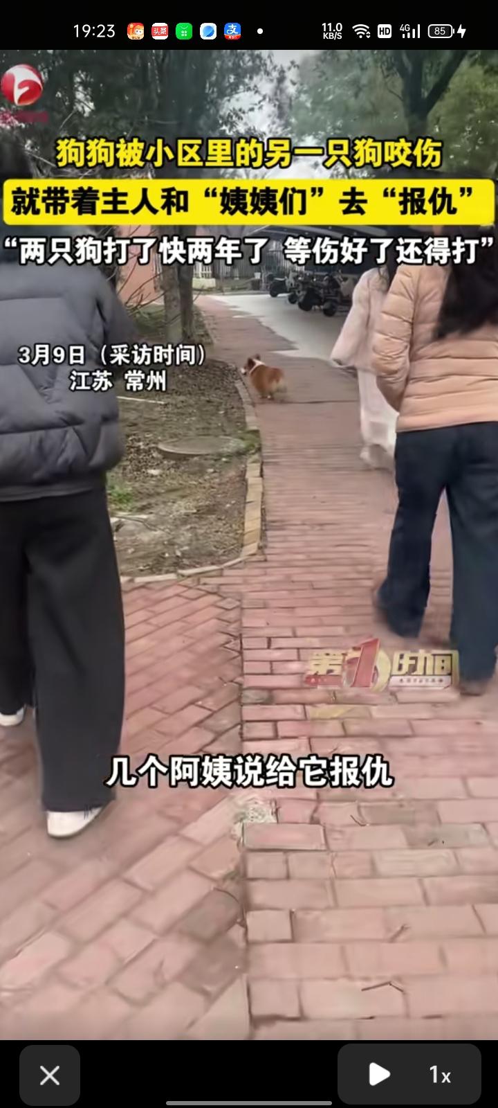 3月9日,江苏常州。女子发视频称,狗子在小区里被小白狗骑着身上咬,几个阿姨既心疼又生气,说要去给它报仇。它一听到几个阿姨说要报仇就来劲了,就带着头去找的。后来,几个阿姨捡了几根棍子去吓唬小白狗,但是没效果,两只狗打了两年了,等伤好了还得报仇