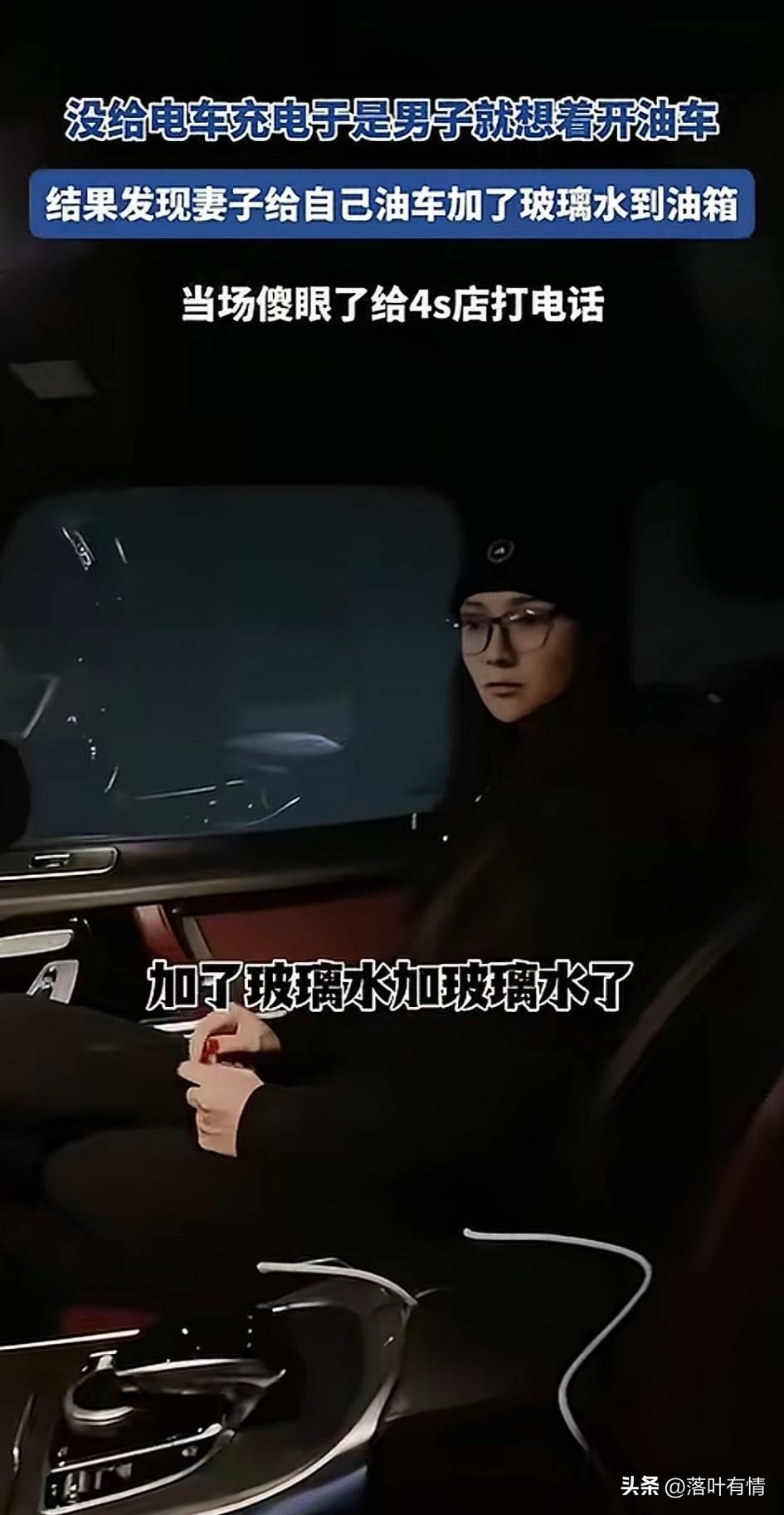 妻子和老公出门, 由于车辆没有充电, 就想着开家里的油车, 到了地下车库一看, 发现车底, 他媳妇居然把玻璃水加到油箱里了, 她老公看到之后直接崩溃, 没想到媳妇儿居然这么傻, 让媳妇儿赶紧给4s店打电话, 直接让4s店上门修车吧!