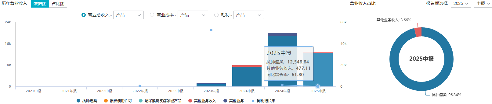 从营收结构来看,2025年中报显示,抗肿瘤类产品收入占比达96.34%,泌尿系统疾病领域产品仍处于培育期。希维她作为公司在女性健康领域的首款获批创新药,其商业化成效不仅关乎产品本身的成败,更决定着公司能否摆脱持续亏损的困境,实现盈利拐点。