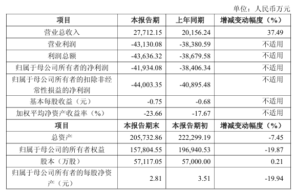 根据2025年度业绩快报,公司去年实现营业收入2.77亿元,同比增长37.49%;但归母净亏损扩大至4.19亿元,扣非后净亏损达4.4亿元。