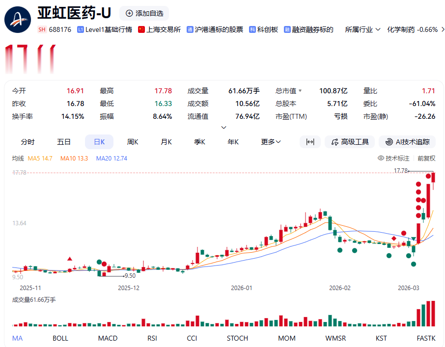 资本市场迅速用真金白银投下信任票。3月4日,亚虹医药录得20%涨停;短暂调整后,3月6日再度封死涨停,走出3天2板的强劲走势。截至3月9日收盘,公司股价报17.66元/股,涨幅5.24%,市值重返百亿上方。