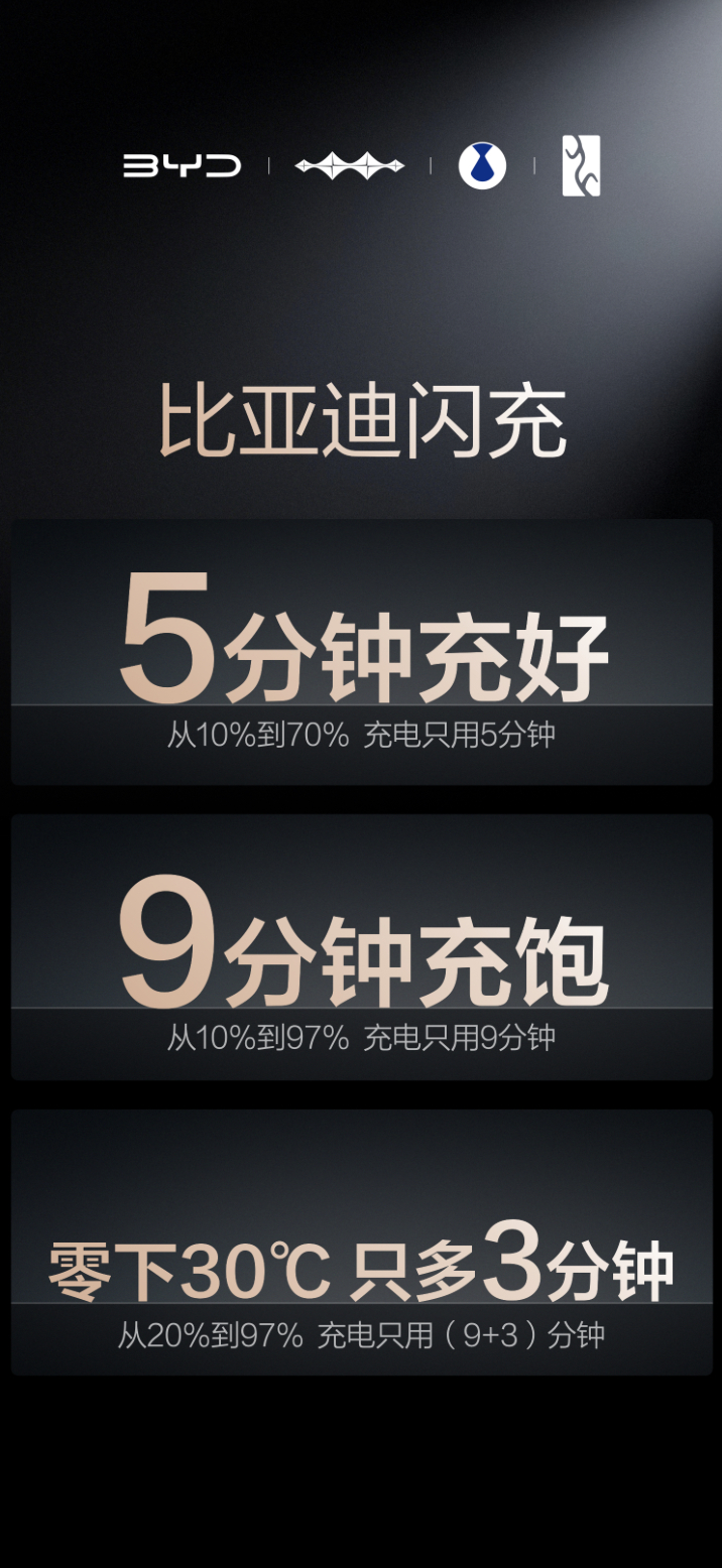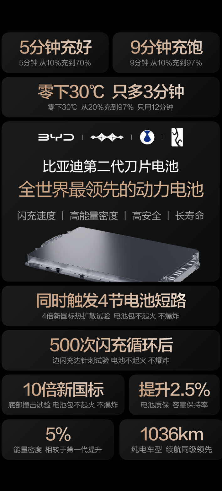 给大家盘一盘前些天比亚迪发布的第二代刀片电池,可以说是进一步消解了大家对新能源汽车的电池焦虑,刷新了印象。你看,常温充电,5分钟充好,9分钟充饱;低温充电,零下30度也只多3分钟,真的是给行业和用户来了一波大惊喜。这不仅仅是口号,更是现实,绝对的硬核闪充技术树立行业新标杆!