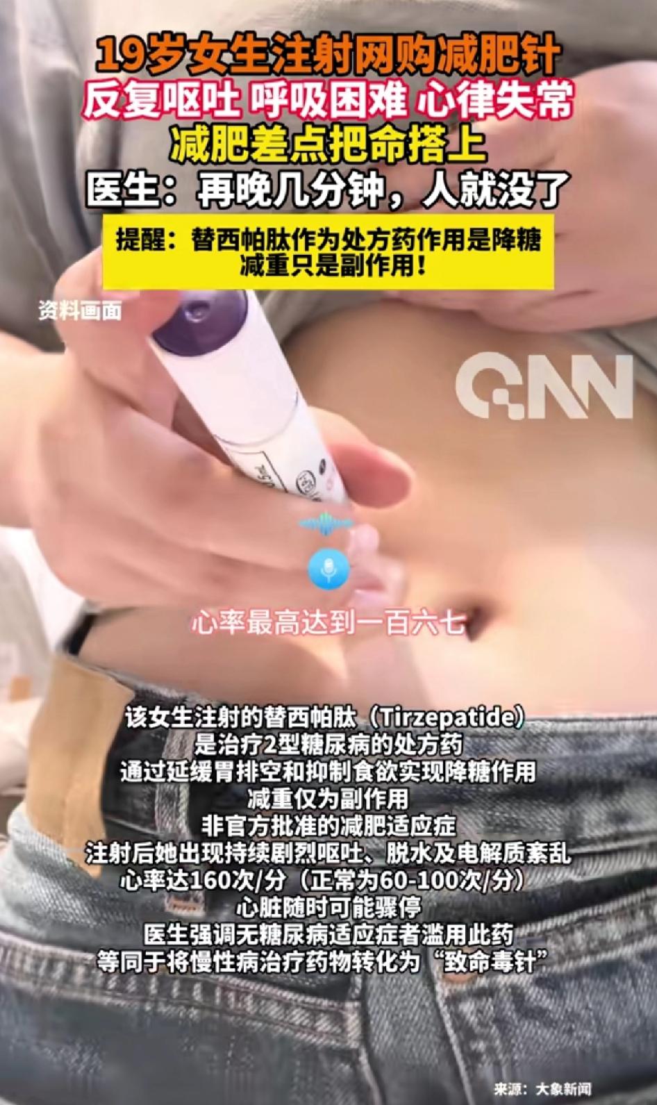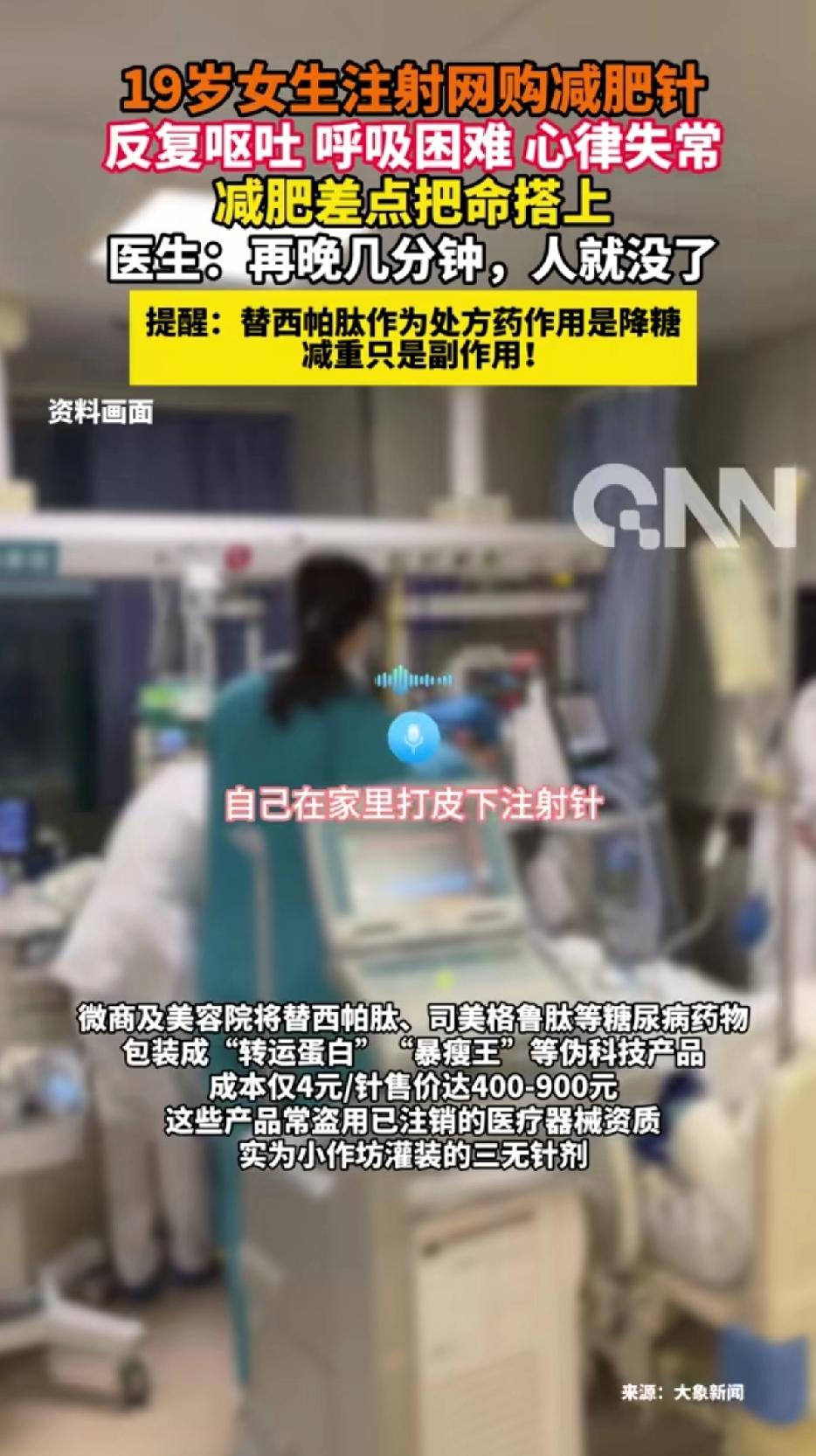 19岁女生自己注射网购减肥针后,反复呕吐、呼吸困难、心律失常,减肥差点把命搭上! 医生:再晚几分钟,人就没了。 现在的网红“减肥针”真是害人不浅!今年3月,19岁的陈女士为节后快速瘦身,自行网购替西帕肽自己在家进行皮下注射,结果反复呕吐、心率飙到160次/分,严重心律失常,差点丢了命。 替西帕肽本是治疗2型糖尿病的处方药,在降糖时会让人吃少、体重下降,就被炒作成“不运动、不忌口也能瘦”的神药。 被微商包装成减肥神药,成本只要4元/针,售价却达400-900元。这些产品常盗用已注销的医疗器械资质,实为小作坊罐装的三无针剂。 但它从来不是官方认可的减肥药,自行乱用风险极大。打多了会让胃动力丧失、肠胃出血,还可能脱水、电解质紊乱、心律失常,甚至过敏窒息。 长期乱用还可能刺激致癌基因、诱发甲状腺癌。年轻人可别再被忽悠,减肥还是得走健康正道!