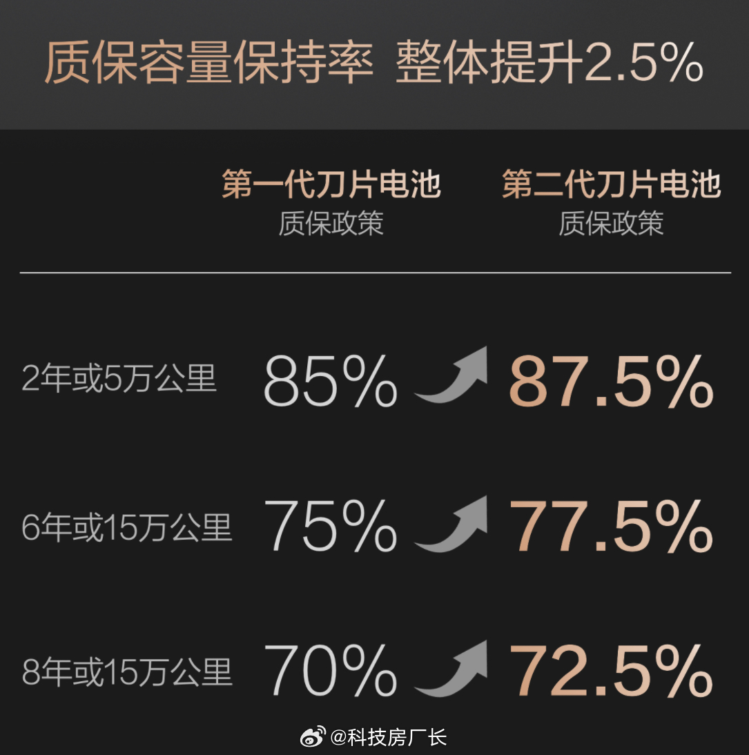 Q2:用上两年闪充,电池会不会就废了?答:第二代刀片电池寿命更长,而且保证电池容量低于77.5%就免费换,电芯终身保修,没底气不敢这么承诺。