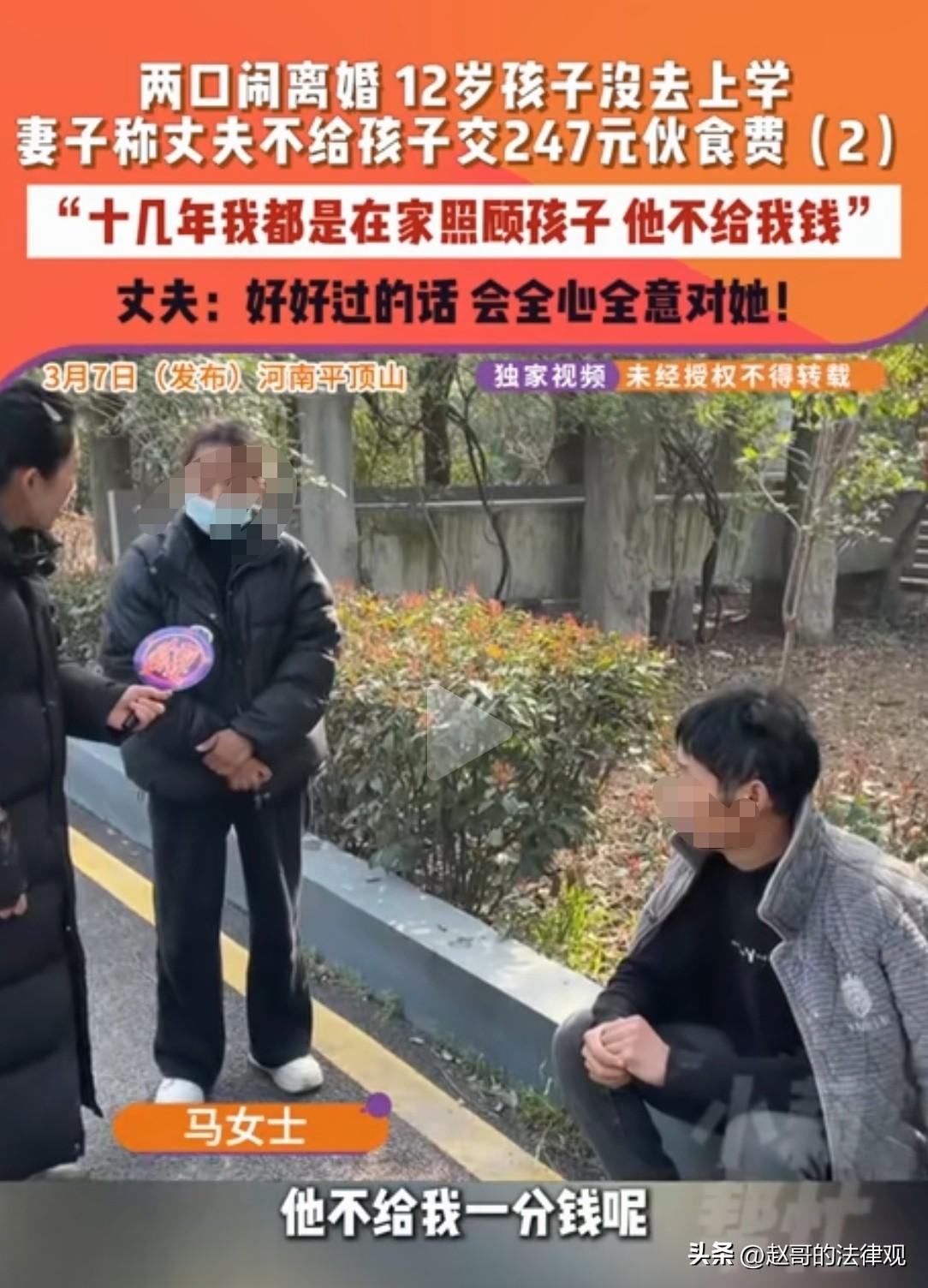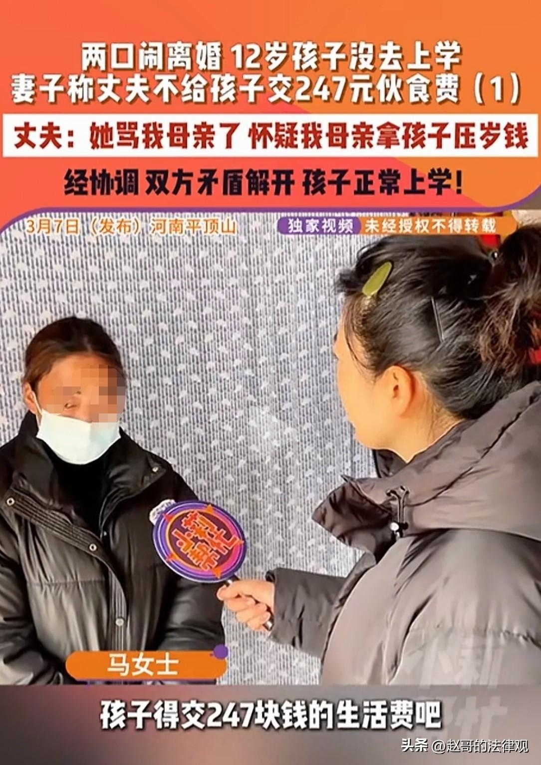 贫贱夫妻百事哀!河南平顶山,女子怀疑婆婆偷拿了孩子的压岁钱,一怒之下骂了几句。丈夫不干了,直接掐断妻子的经济来源,孩子的247元伙食费也不交,也不给妻子生活费了。妻子十几年没工作,平时花一分要一分,手里没有一点积蓄,事情闹得不可开交。最终却得知,压岁钱是被孩子花了,但家庭矛盾,还是不可避免的爆发了。 学校已经第3次催缴伙食费也,儿子都急哭了。 马女士无奈之下,再次给丈夫打电话,让他给儿子交了247块钱的伙食费。 意料之中,丈夫冷冷回绝了。 原因,还是几天前马女士对婆婆骂了那几句狠话。 孩子最终急的哭了,也没交上伙食费,学也不去上了。 事情得从3天前说起,儿子过年收的3000多块压岁钱,放在卧室抽屉里。 要交伙食费了,马女士发现钱没了。 她脑子里“嗡”地一下,第一个想到的就是婆婆。 这怀疑也不是凭空来的,这些年,婆婆在这个小家里,手伸得太长了。 买房子装修,婆婆说了算;孩子怎么教育,婆婆最后拍板。 就连马女士自己屋里的事,婆婆也总爱插一脚。 这一件一件事,像石头一样压在马女士心里,一天比一天沉。 那天,看着空荡荡的抽屉,她心里的火“噌”一下就蹿到了头顶,压都压不住。 “妈,你是不是动孩子钱了?” 话冲出口,带着火星子,她又忍不住骂了句狠话。 婆婆愣在当场,脸一下子涨红了。 孩子就在旁边看着,老太太下不来台,哆嗦着嘴唇说不出话。 王先生是个孝子,一听媳妇敢这么跟自己妈说话,火气“轰”地就上来了。 在他眼里,母亲年龄大了,怎么做都没错。 自己买的房子,老太太爱去哪儿去哪儿。 妻子就算有天大的委屈,也不能当着孩子的面让老人难堪。 他觉得,自己作为丈夫、作为儿子的权威,被妻子踩在脚底下狠狠碾了几下。 王先生回到家,没吵也没闹,直接使出了最狠的一招。 你不是能吗?不是敢骂我妈吗? 好,那你自己想办法过去。孩子的247块钱伙食费,他不交了。 妻子的生活费,他也一分不给了。 这招直接掐住了马女士的命脉。 她在家里操持了十几年,从青春熬到中年,手心朝上的日子过了太久,手里连几百块钱都凑不出来。 看着儿子因为交不上钱,被老师催,急得眼泪在眼眶里打转,马女士的心像被针扎一样。 她硬着头皮,再次给丈夫打电话,声音里带着哀求:“你就先把那247块伙食费交了吧,别耽误孩子上学。” 王先生却问她,你骂我妈的时候,怎么不想想今天? 一句话,把马女士所有的希望都堵死了。 那247块钱,对一个正常家庭来说,可能就是一顿饭钱。 但在王先生手里,它成了惩罚妻子的武器。 他要让妻子知道,挑战他的权威,是要付出代价的。 而孩子成了这场冷战里最无辜的牺牲品。 12岁的男孩不明白,就因为两百多块钱,成了家里的“问题”。 实在没办法,马女士找来了记者。 调解现场,火药味很浓。 王先生满脸怒气,说妻子不尊重长辈! 马女士也一肚子委屈,自己带大孩子伺候老人,手里没有一分钱可供自己支配。 孩子缩在角落的椅子上不敢出声。 记者蹲下来,轻声问那个一直沉默的男孩:小朋友,你的压岁钱,到底去哪儿了? 孩子憋了半天才说:是他自己偷花了。 怕爸妈骂没敢说,这钱不是奶奶拿的。 空气瞬间凝固了,马女士张着嘴,愣在那里。 她错怪了婆婆,而且因为这个错误的怀疑,还引发了新的家庭矛盾。 王先生也愣住了,自己用切断经济来惩罚妻子的行为,伤害最深的其实是儿子。 为了一口气,他差点让儿子连学都上不成。 王先生承认,自己母亲确实有时候管得太多,缺乏边界感,以后会注意沟通。 马女士也为自己不分青红皂白,指责婆婆道了歉。 王先生当场把247块钱的伙食费转了过去。 钱到账的提示音,代表这场家庭风波暂时画上了句号。 但谁都清楚,247块钱能交上,心结却没那么容易解开。 这场闹剧,像一面镜子,一个觉得付出不被看见,一个觉得权威受到挑战。 中间还夹着一个处处越界的老人。 压岁钱只是个导火索,真正引发矛盾的,是妻子积压在心里的委屈,和丈夫的不理解。 民法典第一千零五十八条:夫妻双方平等享有对未成年子女抚养、教育和保护的权利,共同承担对未成年子女抚养、教育和保护的义务。 丈夫因妻子与婆婆发生口角,就拒绝支付孩子的伙食费。 孩子的伙食费,属于抚养义务的一部分,是父母必须承担的责任,不能被当作惩罚对方的工具。 无论夫妻之间有多大矛盾,都不能影响对孩子的抚养。 这既是法律规定,也是为人父母的基本责任。 对此你怎么看?