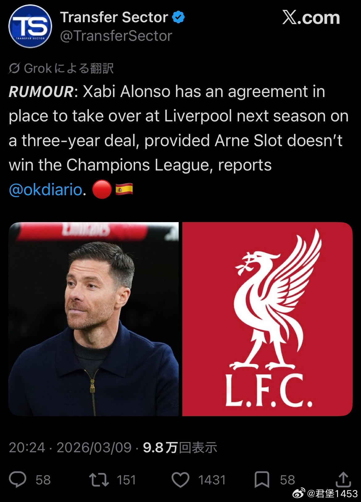 有说法说,如果斯洛特拿不到欧冠冠军,那么利物浦会和阿隆索达成一份三年合同。不仅仅是这个西班牙的新资源,包括几个英国的新资源,以及一些名宿的猜测都指向了斯洛特要用冠军才能捍卫自己的位置,欧冠资格并不是免死金牌。只是在于,足总杯冠军也可以,还是必须是欧冠冠军。
