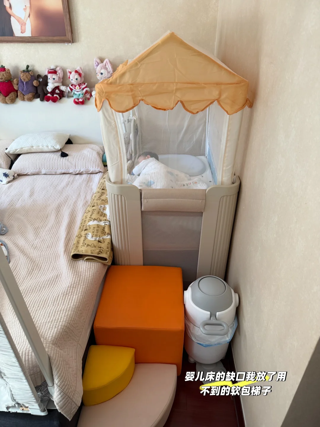 大床上装了两片围栏,婴儿床这侧的缺口拼上之前买的软包楼梯,也不怕宝宝半夜会掉下来,当然最重要的是在宝宝会爬的时候就教给他如何下床🛏️