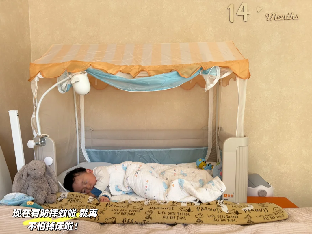 但因为Bebebus这个床的高度问题,会站之后就很担心他摔下来,后来装了一个防摔蚊帐[满月R],把其他的口都拉上、拼接大床的拉锁打开,完美解决~