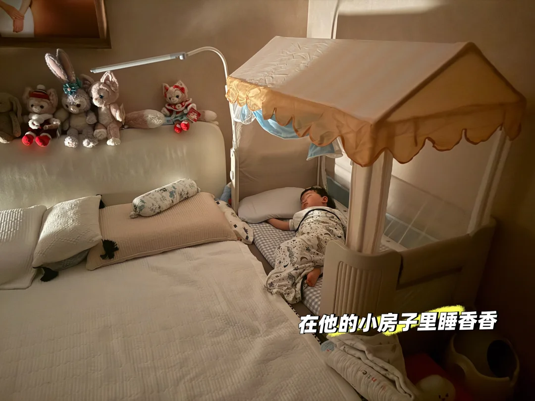 现在我们睡大床+宝宝睡小床,他在小床翻来覆去互不影响,装了个阅读灯、拼接床也非常适合亲子睡前阅读时光~
