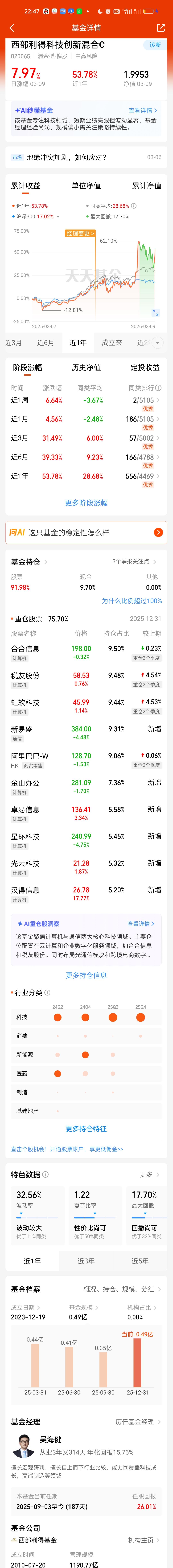 对于西部利得科技创新今天的大爆发我是一点都不意外的,因为这已经不是它第一次大爆发了,确切的说今年西部利得的基金表现都足够强势。 早在2个月前我就对AI应用板块的所有基金都进行过数据对比,当时就已经留意到它了,当然老对手德邦WY一手好牌打的稀烂,也念人唏嘘不已。AI应用板块调整两个月后今天终于再次迎来大爆发,它也以7.97%的超高收益率强势拿下今日收益冠军!不过从持仓来看大概率又调仓换股了。
