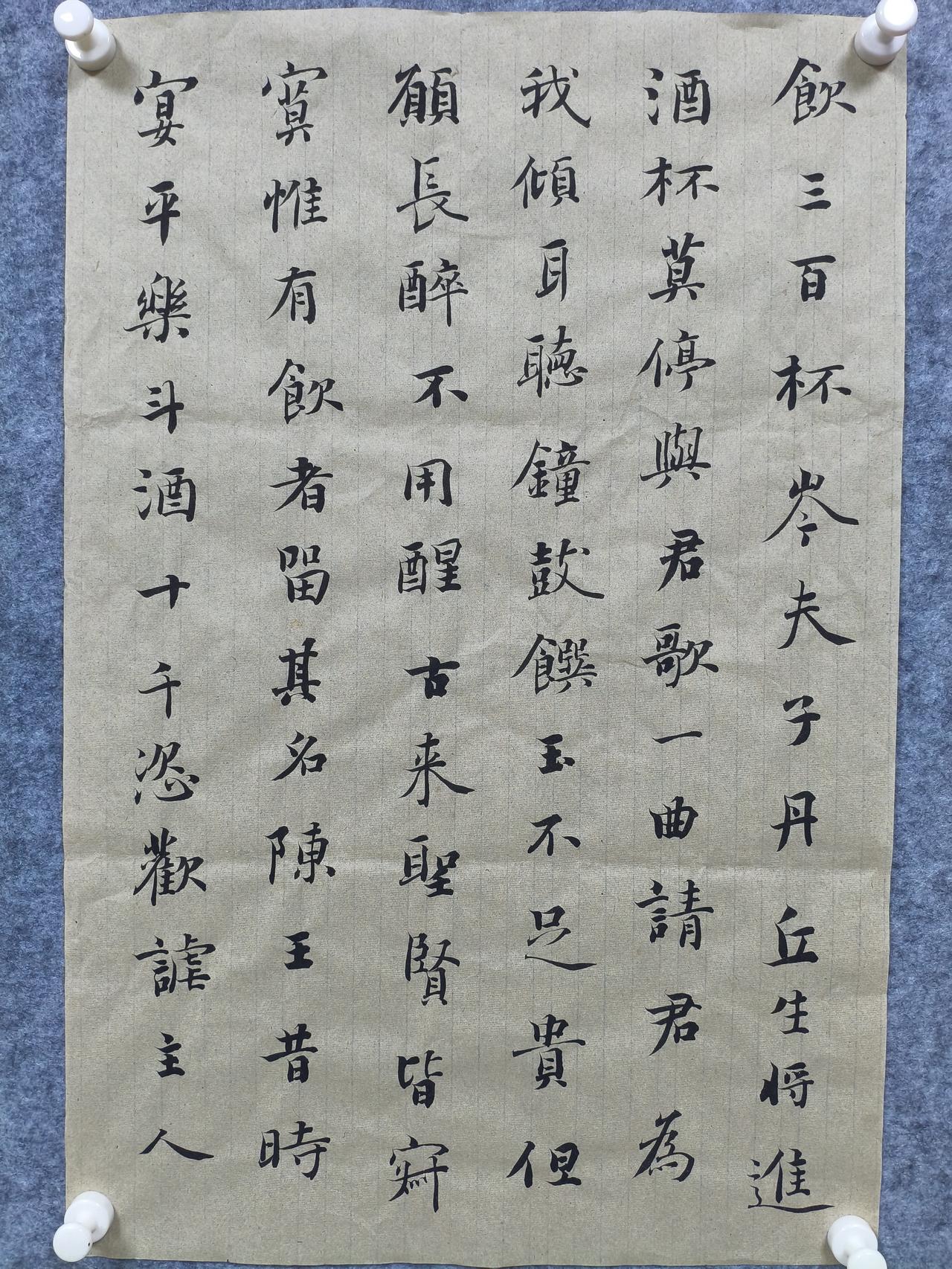 【兼具功底与情怀的佳作】 这幅行楷书写的《将进酒》,笔力沉稳而不失洒脱,墨色浓淡相宜,将李白诗中的豪情与旷达展现得淋漓尽致。竖排布局舒展大气,字间行气连贯,既有楷书的端稳,又有行书的灵动。落款里更添一份春日里对经典的致敬与书写的诚意。是一幅兼具功底与情怀的佳作。