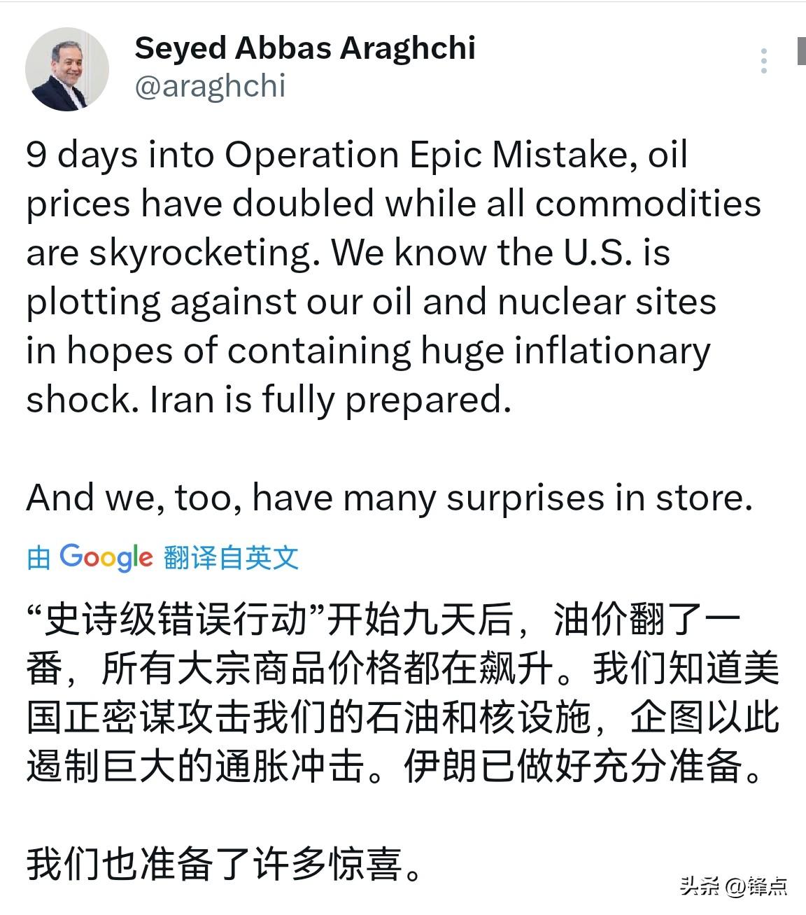 阿拉格齐讽刺美以“史诗级失误行动”,并且准备了诸多惊喜。 伊朗外长阿拉格齐发文写道:““史诗级失误行动”才进行9天,油价就翻了一倍,所有大宗商品价格都在飞涨。我们知道美国正在策划打击我们的石油和核设施,试图遏制巨大的通胀冲击。伊朗已做好充分准备。而且,我们也准备了很多惊喜。” 感觉伊朗彻底不再信任美国和以色列,不抱有任何不切实际的幻想后,反而卸下了所有枷锁,越来越自信、从容了。没有歇斯底里的叫嚣,只用一句轻飘飘的“准备了很多惊喜”,足以让对手陷入癫狂!