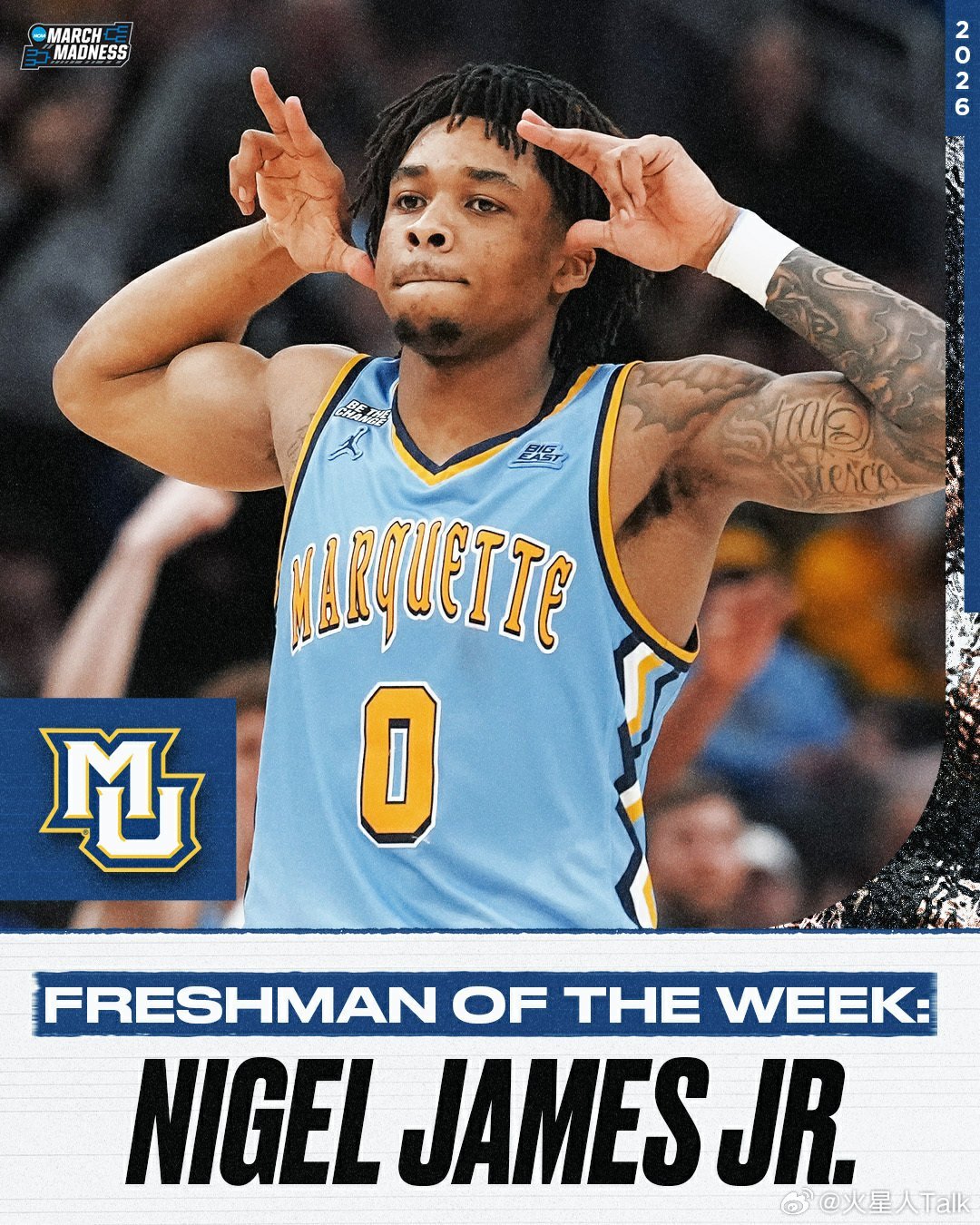 NCAA官网第18周NCAA男篮最佳球队:德州基督教大学,最佳球员:Cam Boozer,最佳新人:Nigel James Jr。