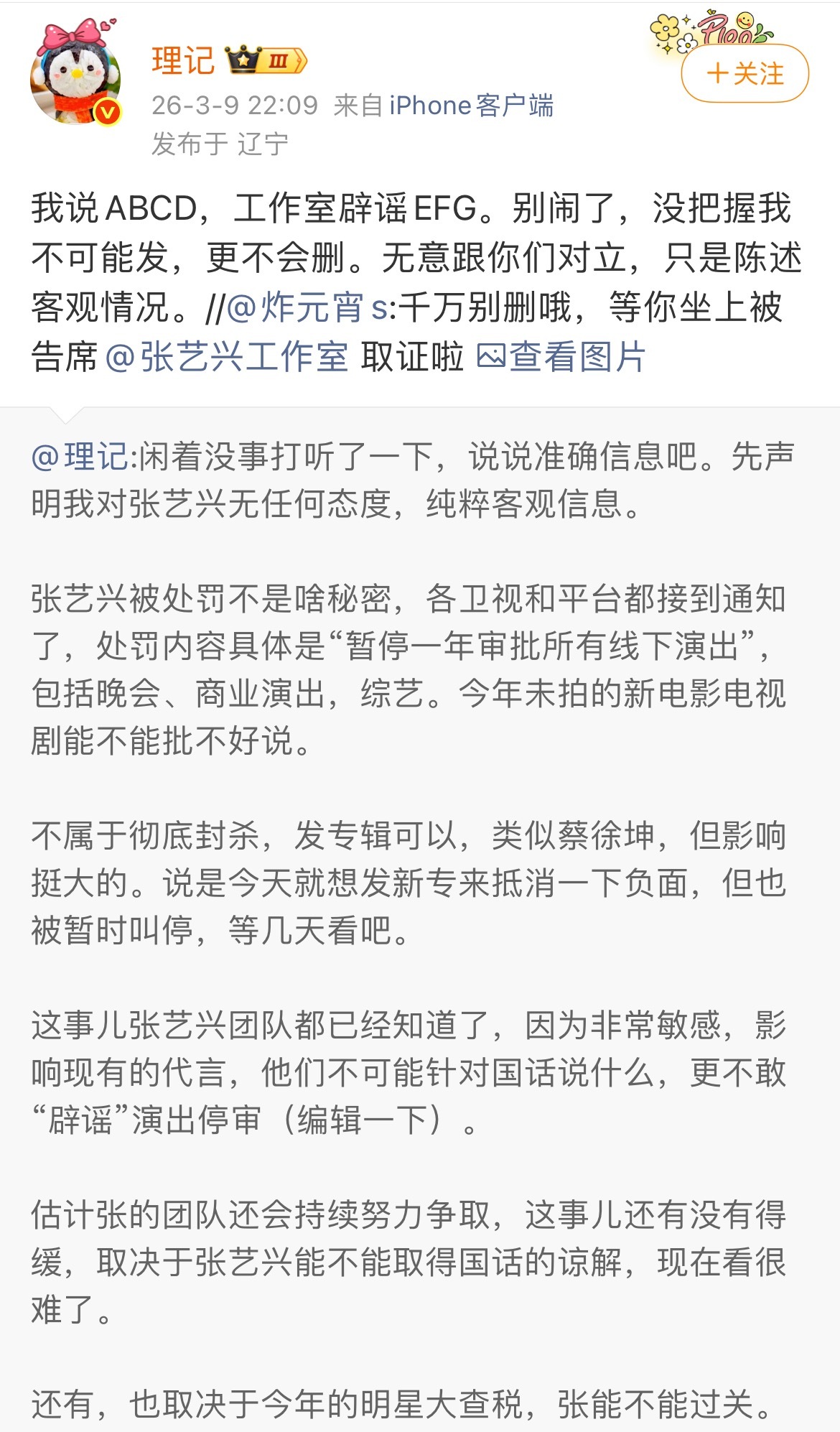 理记在张艺兴发声明后还在硬刚,说自己没把握不可能发,更不会删博。