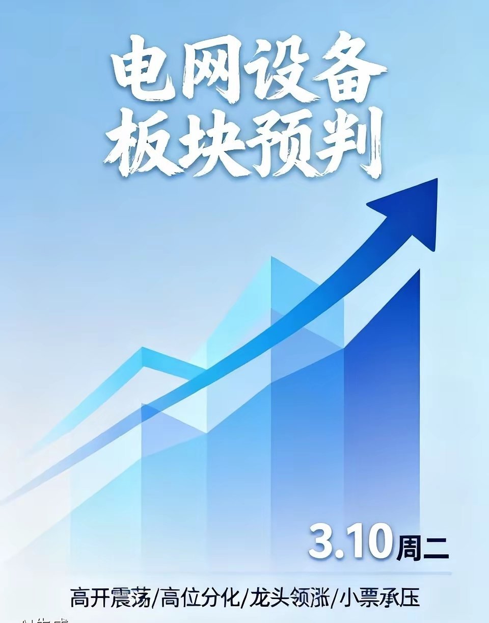 明日电网设备板块走势分析明日周二(3.10)电网设备板块走势核心预判整体高开震荡、高位分化、龙头领涨、小票承压; 指数高开振荡整理,风格中军稳、弹性强、小票分歧大。一、驱动逻辑(美伊冲突+政策+资金)1、 美伊冲突强化避险+能源安全① 霍尔木兹海峡封锁风险加剧,全球能源供应链紧张,电网作为能源传输生命线战略地位凸显 ;② 中东电力设施损毁,海外重建+备电需求升温,中国设备出口预期提升;③ 板块具备防御+成长双重属性,成为资金避险首选。2、 国内政策+订单双轮驱动① “十五五”4万亿电网投资+2026年7200-7800亿年度计划,特高压投资1200亿(+25%);② 政府工作报告首提算电协同,AI算力用电拉动电网智能化升级 ;③ 3月为招标密集期,订单落地持续催化业绩。3、 资金面:机构主导、情绪偏强① 电网设备ETF持续净流入,机构持仓稳定,无大规模撤离;② 技术面:均线多头、MACD红柱再扩,强势格局未破。二、明日1、 中军龙头(稳健性)① 国电南瑞、中国西电、特变电工2、特高压/弹性龙头(波动)① 许继电气、平高电气、思源电气、四方股份3、 线缆/零部件(分化明显)① 汉缆股份、东方电缆、宏发股份4、风险① 板块短期涨幅大,获利盘兑现压力,盘中可能跳水② 大盘若受避险情绪拖累低开,可能带崩板块开盘③ 小票无基本面支撑三、 电网设备核心龙头(按赛道分类,最新)1、综合/二次设备(板块压舱石)① 国电南瑞(600406)电网智能化/二次设备绝对龙头;特高压控制保护市占率70%+,省调以上调度系统75%+;在手订单620亿+② 思源电气(002028)民营综合设备龙头;覆盖开关、电力电子、储能;弹性强、机构偏好2、特高压(输变电核心)① 中国西电(601179)特高压全产业链央企;换流阀、GIS、变压器全覆盖;千亿市值,资金容量大② 特变电工(600089)全球变压器龙头;特高压换流变市占率35%+;海外订单强劲(沙特164亿)③ 许继电气(000400)特高压直流换流阀龙头;市占率37%-40%;柔直技术领先④ 平高电气(600312)特高压GIS开关龙头;市占率44%;1100kV断路器icon技术领先3、配网/线缆/细分龙头① 四方股份(601126)配网自动化+继电保护;AI故障预测95%+② 汉缆股份(002498)线缆+特高压;情绪标杆、弹性大③ 正泰电器(601877)民营能源全产业链;配网+低压电器+光伏储能④ 东方电缆(603606)海缆龙头;受益海上风电与电网出海 一句话速记① 中军:国电南瑞、中国西电、特变电工(稳健)② 弹性:许继电气、平高电气、思源电气(特高压)③ 细分:汉缆股份、四方股份(情绪)【细分梯队:强弱分化或持续显现在板块整体震荡的背景下,内部的结构性分化可能会更加明显。投资者明日可重点观察以下三个细分梯队的表现差异:1、 特高压与出海链:作为订单与出口逻辑最明确的方向,有望成为板块的“稳定器”,关注其能否持续领涨。2、 算电协同与智能配电:产业趋势明确,但业绩兑现相对滞后,更多呈现出“趋势性”机会。3、 传统低压设备:受原材料成本压力影响较大,在板块普涨时弹性偏弱,需警惕其跟涨乏力的情况。】四、风险提示市场有风险,投资需谨慎。对于电网设备板块,明日需重点警惕短期获利盘集中兑现带来的回调风险。此外,大盘整体情绪、地缘政治变化等外部因素,也可能对板块走势产生影响。本文所有内容均基于公开信息整理分析,仅为提供市场观察视角,不构成任何投资建议、引导或承诺。投资者应结合自身风险承受能力,自主做出投资决策并承担相应风险。