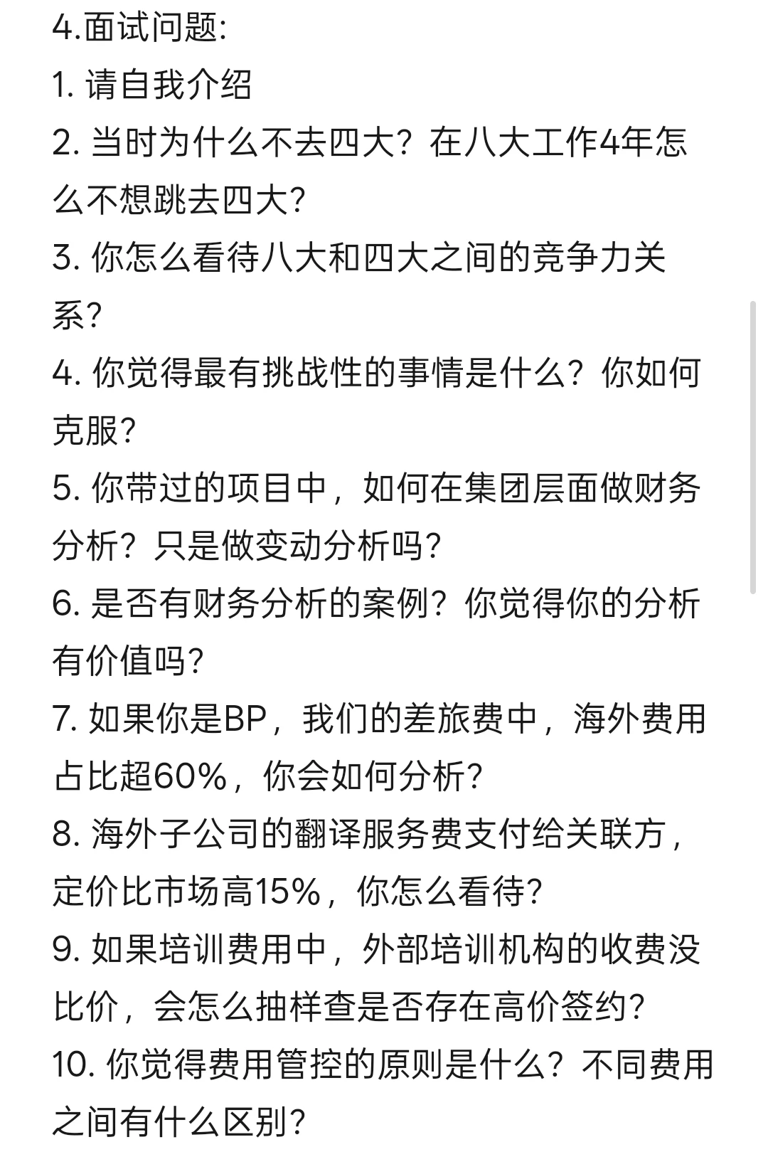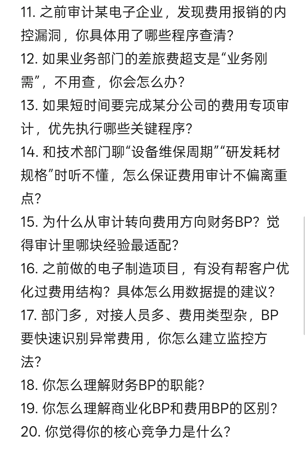 15. 为什么从审计转向费用方向财务BP?觉得审计里哪块经验最适配?