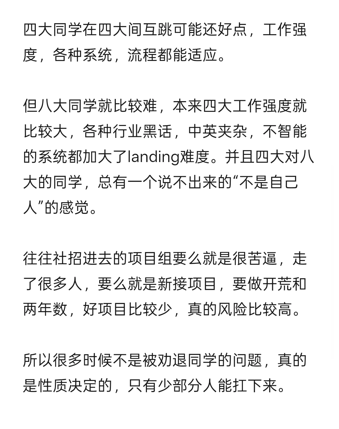 但八大同学就比较难,本来四大工作强度就比较大,各种行业黑话,中英夹杂,不智能的系统都加大了landing难度。并且四大对八大的同学,总有一个说不出来的“不是自己人”的感觉。