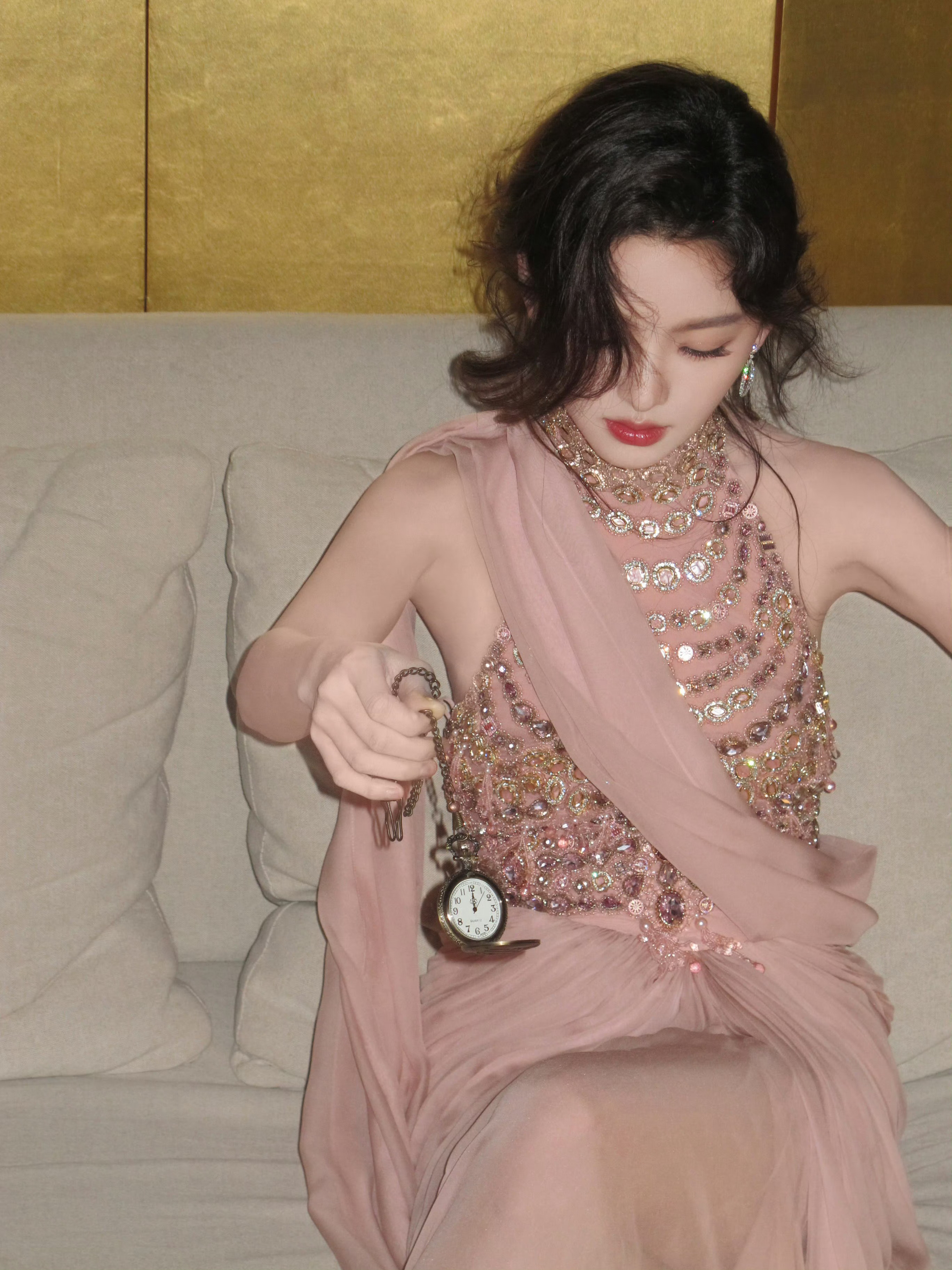 章若楠粉色纱裙粉色纱裙穿在章若楠身上,是恰到好处的清甜。纱质轻盈得像云,裙