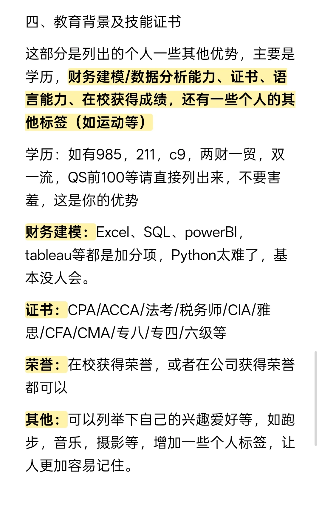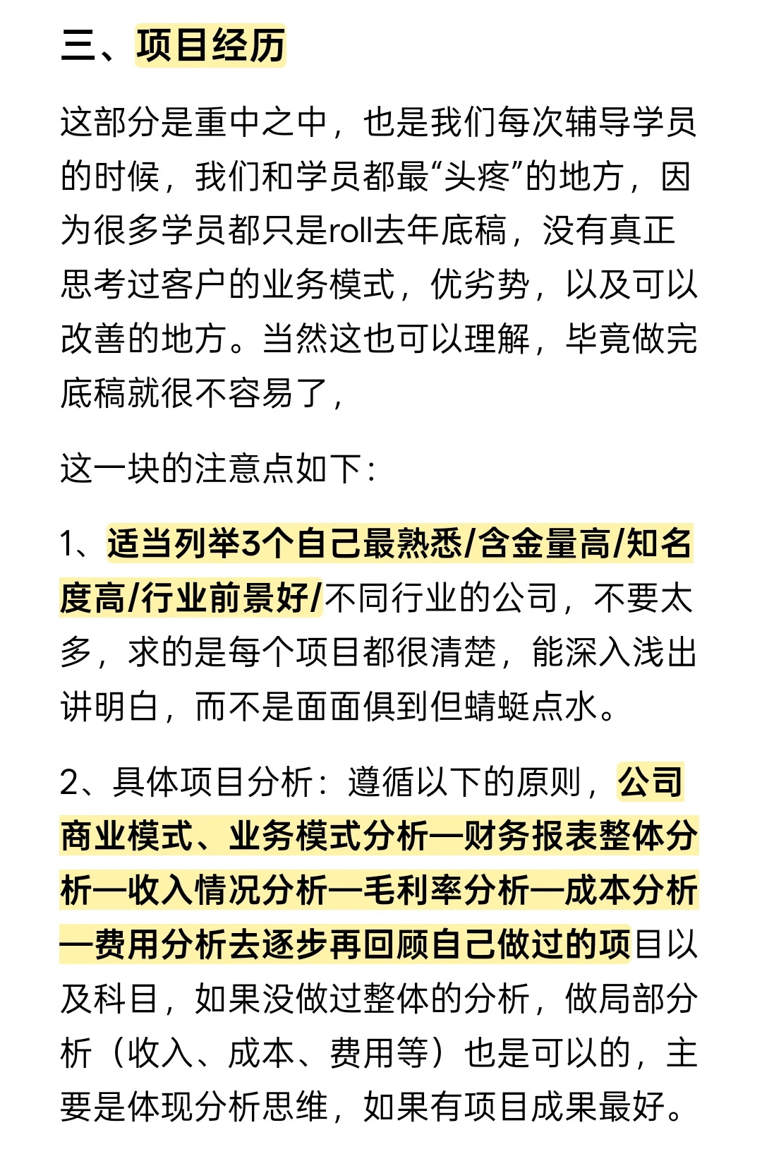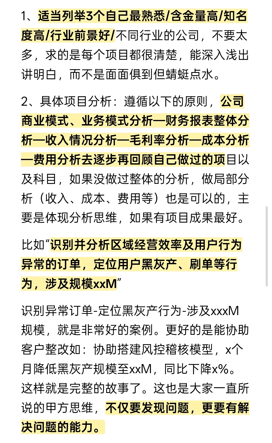 2、具体项目分析:遵循以下的原则,公司商业模式、业务模式分析—财务报表整体分析—收入情况分析—毛利率分析—成本分析—费用分析去逐步再回顾自己做过的项目以及科目,如果没做过整体的分析,做局部分析(收入、成本、费用等)也是可以的,主要是体现分析思维,如果有项目成果最好。