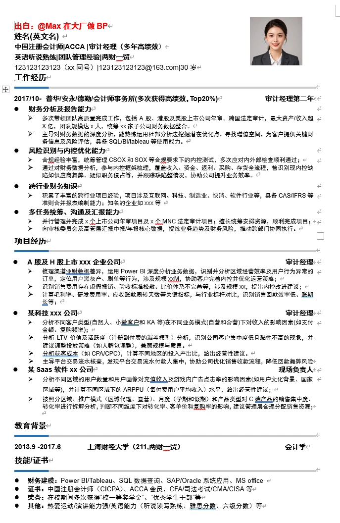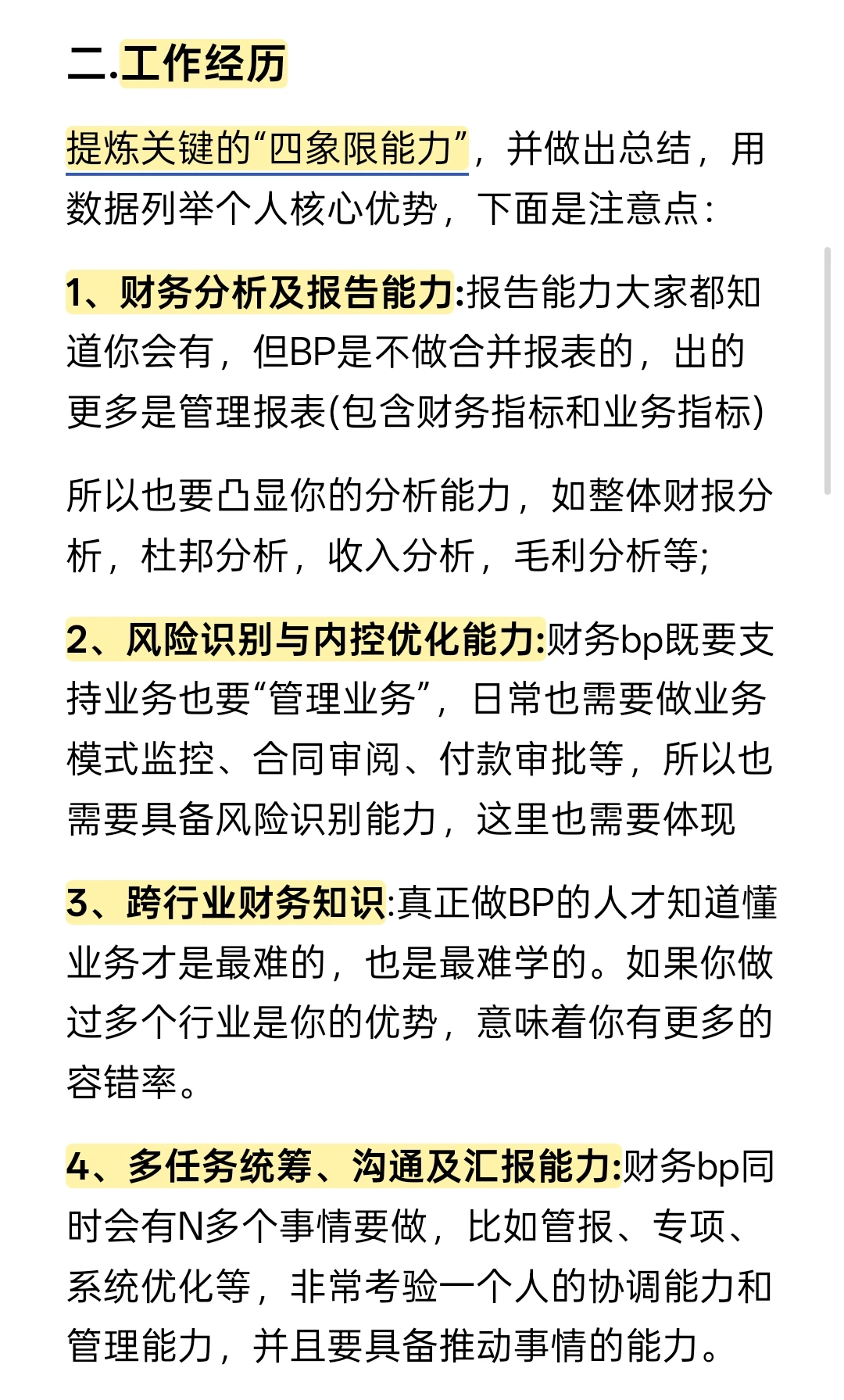 2、风险识别与内控优化能力:财务bp既要支持业务也要“管理业务”,日常也需要做业务模式监控、合同审阅、付款审批等,所以也需要具备风险识别能力,这里也需要体现