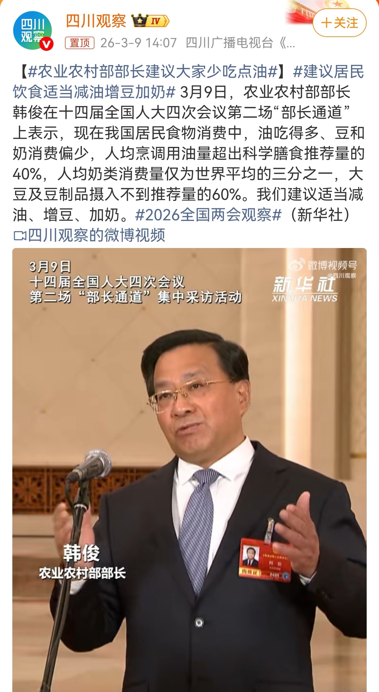 3月9日,全国两会“部长通道”上,农业农村部部长韩俊建议大家适当减油、增豆、加奶