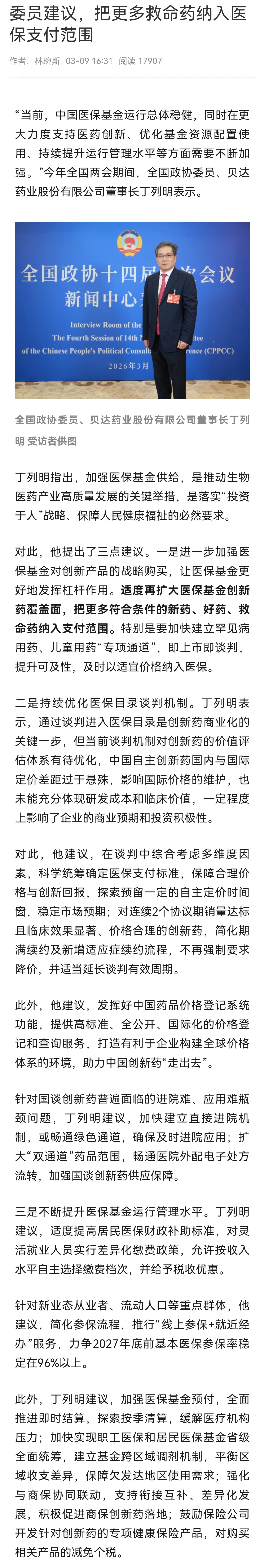 丁列明作为药企代表,提出的建议是,扩大医保基金创新药覆盖面,把更多新药、好药、救命药纳入支付,本质还是希望国家能够提升医保总额预算,同时优化定价机制,针对对连续2个协议期销量达标、临床效果显著、价格合理的创新药,不再强制要求降价。