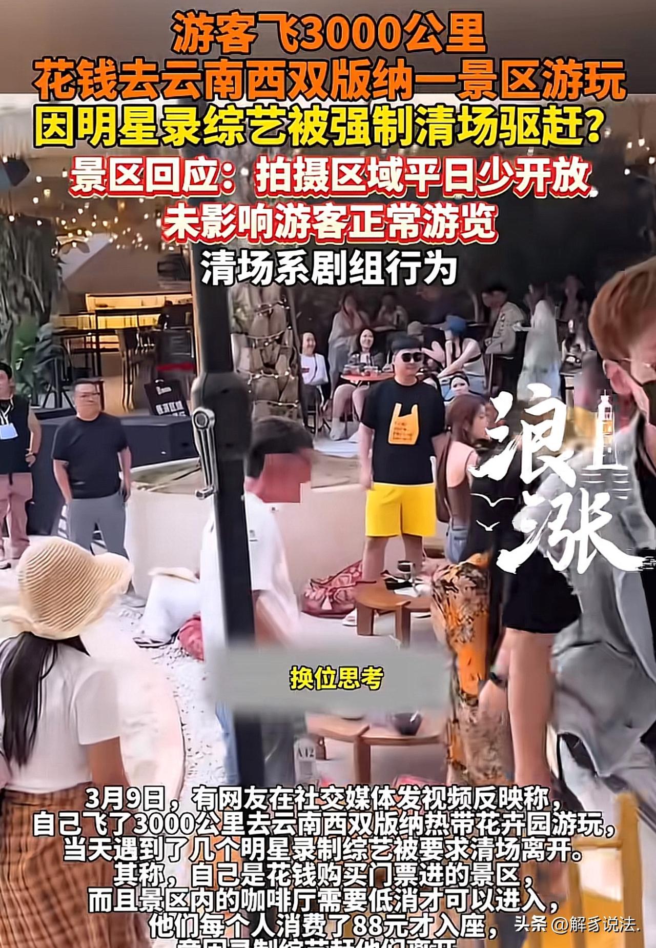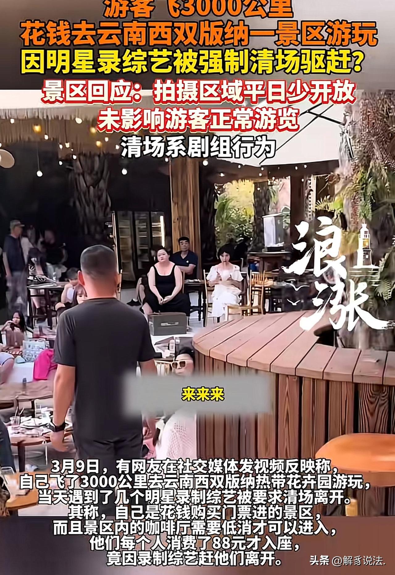 “真欺负人!”云南西双版纳,一网友飞3000公里来到某景区游玩。期间,不仅花了景区门票钱,还在餐厅低消88元。谁知,景区工作人员竟以“明星录综艺”为由,强行对其驱赶,并说换位思考。网友不干了,怒怼:明星来了和我们什么关系?凭什么让我们离开?来都来了,钱也花了,还没玩尽兴!网友一气之下,将此事曝光到网上。景区甩锅说:拍摄区未占营业范围,清场系剧组行为! 3月9日,一名网友将自己在西双版纳某景区游玩时遭遇的不公待遇发布到网上,引发了广泛关注。 该网友为了这次旅行,提前很久就做好了详细攻略。 她特意从家乡出发,飞越3000多公里,一路奔波劳累,就是想感受当地温暖的气候和迷人的热带风光,好好放松心情。 可谁也没想到,刚踏进景区,这份好心情就被彻底打碎了。 这位网友按规定买了景区大门门票,开开心心进了园。 逛了一阵子之后,她腿脚发酸、肚子也饿了,就想着去景区里的餐厅坐下来歇歇脚、吃点东西。 可景区餐厅有最低消费,她没办法,又额外花了88元才顺利入座。 本以为这下能安安稳稳休息一会儿,好好享受期待已久的旅途,可屁股还没坐热,几名现场工作人员就急匆匆走了过来,语气特别冲、态度十分强硬,直接要求他和其他游客马上离开,一句话解释都没有,只说有明星团队要在这里录综艺节目,必须立刻清场。 游客当时一下子就懵了,心里又委屈又生气。 自己千里迢迢飞了3000多公里,花了钱买门票,又花了钱消费吃饭,凭什么说赶人就赶人? 她压着心里的火气,试着跟工作人员好好沟通,说如果提前告诉大家要清场,他完全可以理解配合,可现在临时被赶,谁都接受不了。 可工作人员根本不听他说话,也不做任何解释,只是一个劲地催促、驱赶,语气生硬,脸色难看,完全不管游客的感受。 网友心里的火气一下子就上来了,原本满满的期待,瞬间变成了一肚子的委屈和愤怒,好好的旅行兴致被彻底搅黄,一路上的辛苦全都白费了。 网友越想越气,实在不愿意就这样吃哑巴亏。 她看着工作人员强硬的态度,再想想自己一路的奔波,心里又难过又不服气。 于是,她一气之下拿出手机,把现场被驱赶的画面全部拍了下来,将自己的遭遇一五一十发到网上,曝光景区这种不讲道理的做法。 视频一发出,很快就引起了大家的关注。 事情发酵后,3月9日,有记者以普通消费者的身份,专门打电话联系景区了解情况。 景区工作人员却轻描淡写地回应说,综艺录制已经结束了,当时只是用围挡围起一小块地方,占用也就10几分钟,拍摄区域也没占到正常营业范围,还把责任推得一干二净,说清场是剧组的行为,跟景区没有关系。 听到这样的回应,该网友更加心寒。 明明是景区管理不到位、没有提前告知,却把责任推给别人,让花钱消费的游客,白白受了一肚子气。 《消费者权益保护法》第8条:消费者享有知悉其购买、使用的商品或者接受的服务的真实情况的权利。 游客购票入园、消费餐饮,与景区形成消费服务关系,依法享有知情权。 景区明知将有综艺录制并需临时清场,却未提前公示、告知游客,剥夺了游客知晓服务受限、自主选择行程的权利。 景区以“清场系剧组行为”推脱责任,不影响其作为经营者的法定告知义务。无论清场由谁执行,景区未履行信息披露义务,已侵犯游客知情权。 此举既违背消费公平,也损害游客合法权益,景区应承担相应责任,完善提前告知与补偿机制。 此事曝光后,网友看法不一: 不是现在的明星为啥有这么大权利,走到哪安保 ,公安 交警 消防都得配合,他们谁给的权利,动用公共资源花的谁的钱。 跟明星关系不大,主要是景区收了人家剧组的钱了,一边收个游客的门票,一边收着剧组的钱,两头通吃,吃相太难看了! 现实情况是这个人知道了某明星在这里录节目,特地飞过去,想现场追星,结果没进去,恼羞成怒,说自己是去旅游的! 欢迎关注@解豸说法.