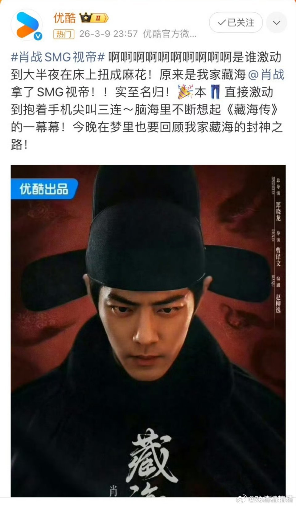 肖战SMG视帝恭喜肖战,早就该拿奖了!藏海传2025年的唯一剧王史上最年轻的视帝!你知道古装剧拿奖多难吗?当年甄嬛传都没拿奖,再次恭喜肖战!!恭喜藏海大人!!实至名归啊!!!!