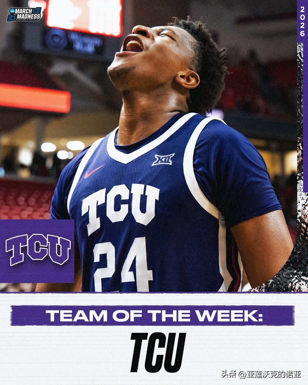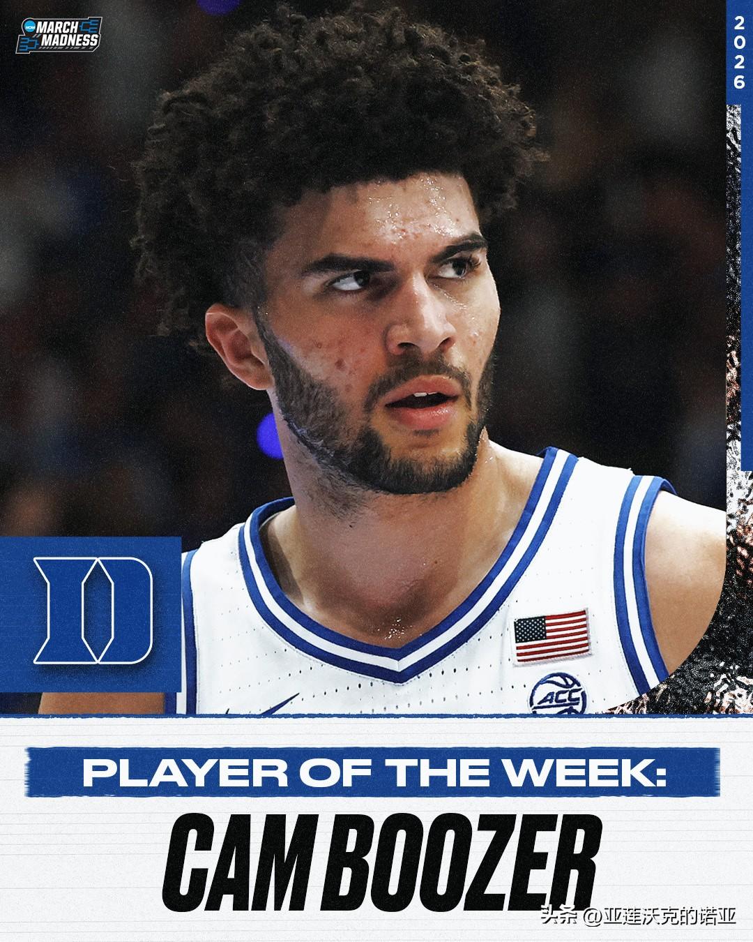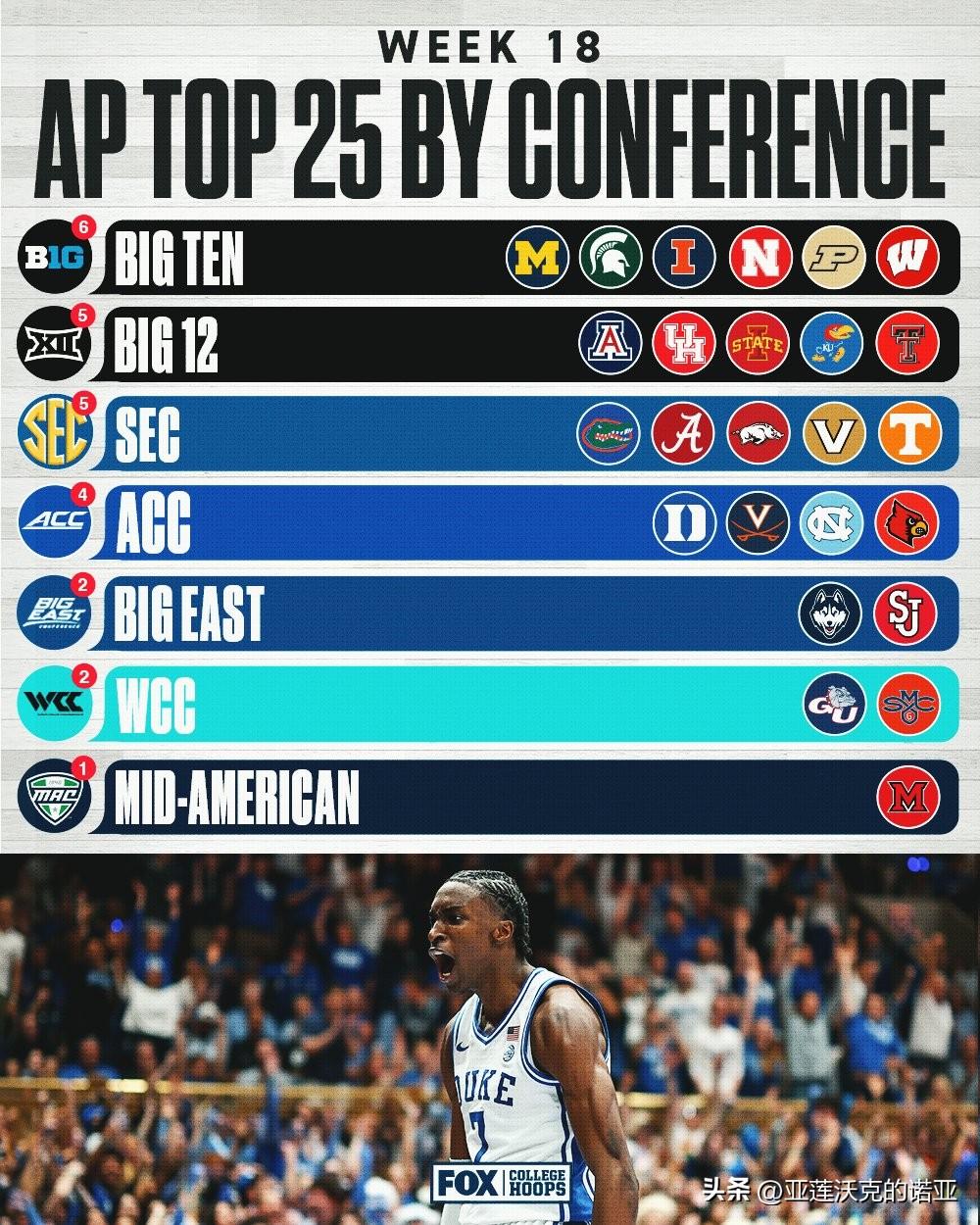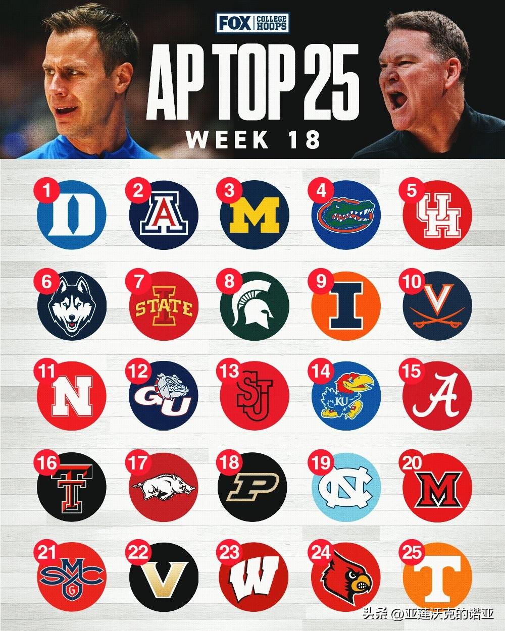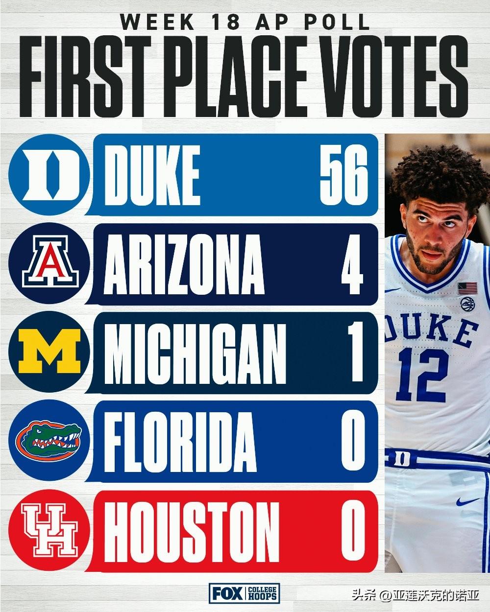 美联社公布第十八周前25强榜单,ACC联盟常规赛冠军杜克大学稳居全美第一,Big 12冠军亚利桑那大学,Big Ten冠军密歇根大学,SEC冠军佛罗里达大学紧随其后,官网评选的上周最佳球队是TCU,2026年nba选秀 最佳球员是杜克Cameron Boozer,最佳新人是马奎特Nigel James。