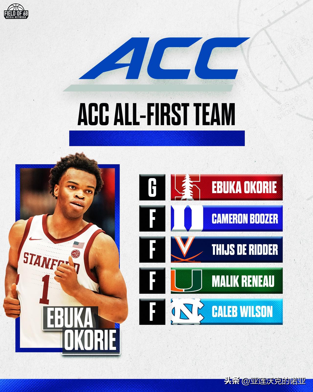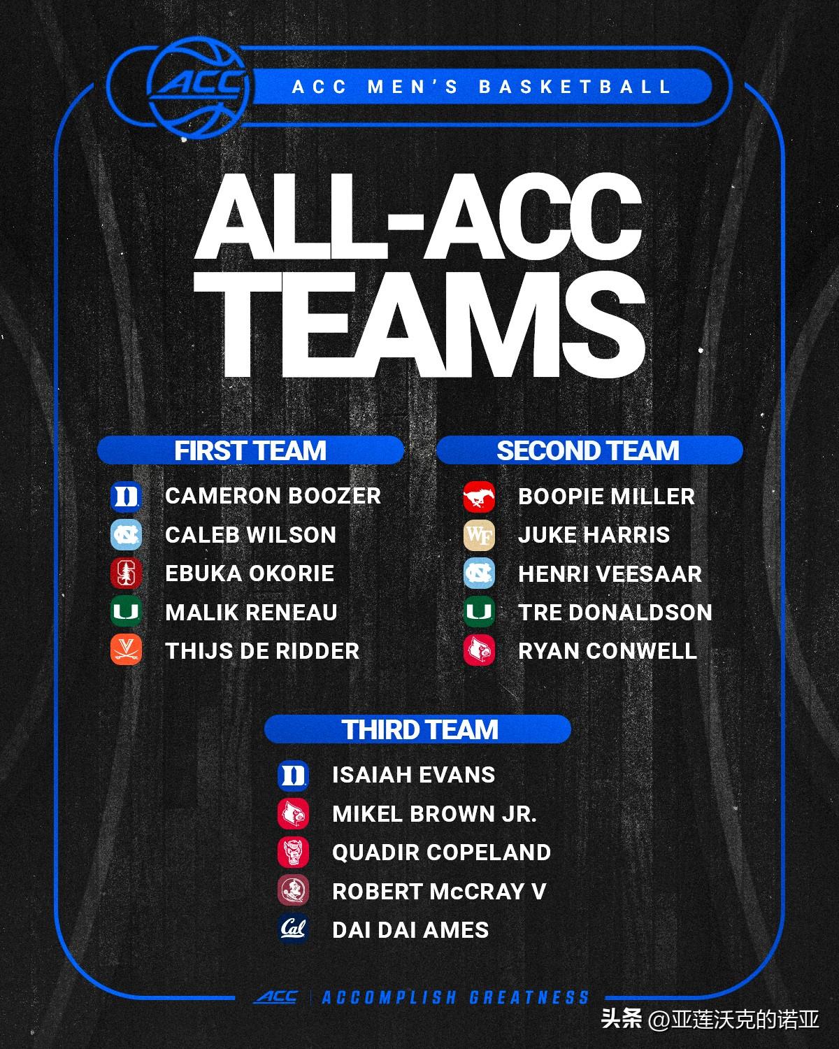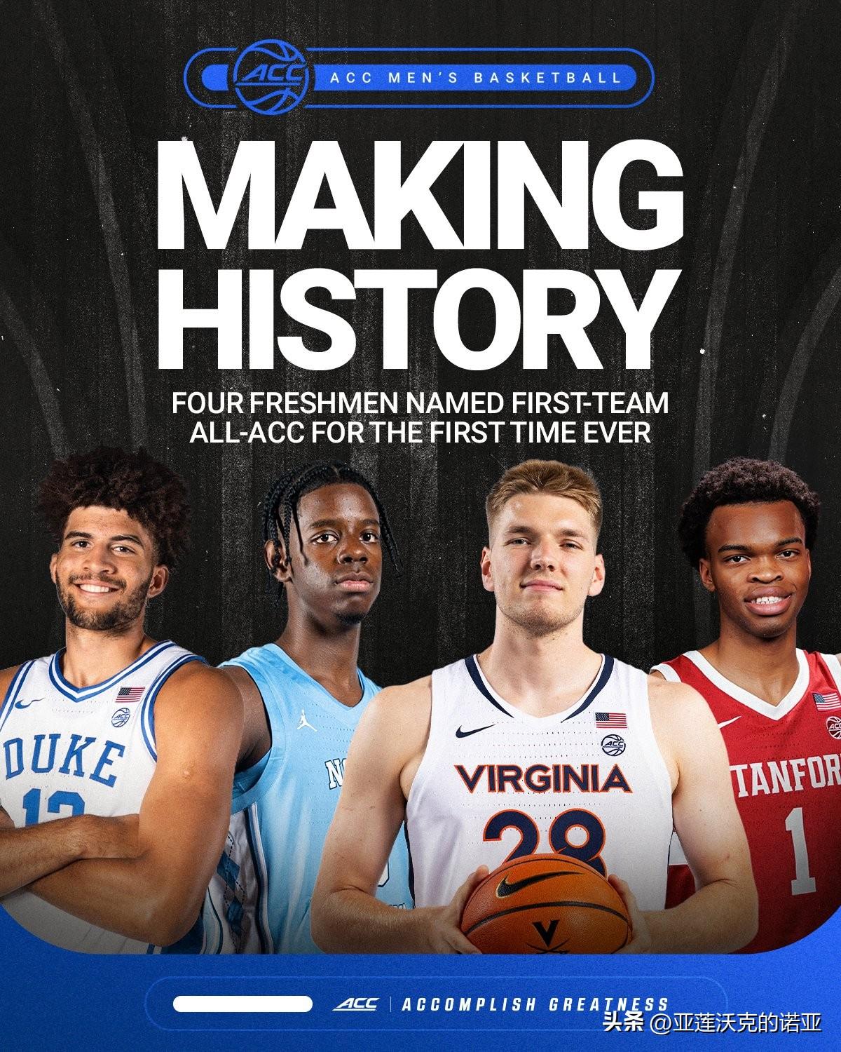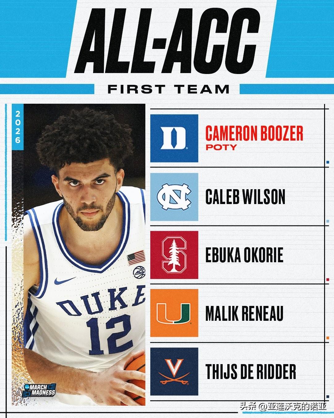 杜克大学横扫了ACC联盟的季末奖项,维克森林后卫Juke Harris当选最快进步球员,ACC联盟第一阵容创造历史有四位新生入选,2026年nba选秀 杜克Cameron Boozer,北卡Caleb Wilson,斯坦福Ebuka Okorie,迈阿密Malik Reneau,弗吉尼亚大学Thijs De Ridder。