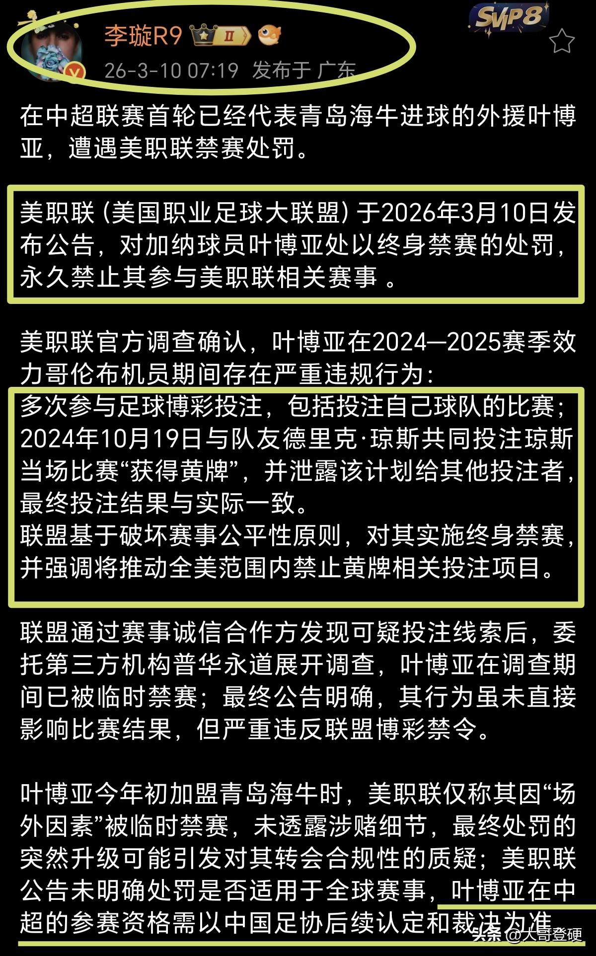 邝兆镭或喜从天降!青岛海牛外援叶博亚被美职联终身禁赛了[恐惧] 北京时间3月10日上午,《足球报》主任李璇在其个人社交媒体上发文,透露了一则关于青岛海牛外援叶博亚的重磅消息[震惊] 据美职联2026年3月10日发布公告,对加纳球员叶博亚处以终身禁赛的处罚,永久禁止其参与美职联相关赛事[恐惧] 美职联官方调查确认,叶博亚在24/25赛季,效力美职联哥伦布机员期间,存在严重违规行为:多次参与足球博彩投注,包括投注自己球队的比赛[钱] 据悉,叶博亚冬窗压哨加盟青岛海牛时,美职联仅称其因“场外因素”被临时禁赛,未透露涉赌细节,但最终经过查实,美职联决定对其实施终身禁赛[震惊] 但叶博亚在中超的参赛资格是否可以继续维持,需以中国足协后续认定和裁决为准,不知道足协是否会出手对这样的外援进行处罚[吃瓜群众] 该说不说!青岛海牛队引援之前,好像背调工作做的不够充分,竟然把这样的有前科的外援引进队内。如果叶博亚再次启动玩球模式,领着几个外援一起玩儿,那青岛海牛队真的存在加速降级的可能性了[融化] 一旦叶博亚被足协处罚,那么与其同位置竞争的邝兆镭,出场时间时间或迎来巨幅增长!这回恐怕真的有机会降维打击中超了[加油]