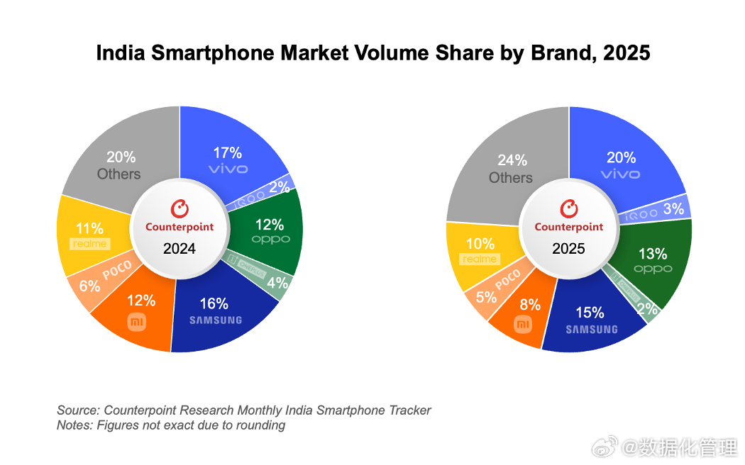 2025年印度智能手机销售额同比增长8%。从厂商来看,vivo(不包括 iQOO)在印度智能手机市场占20%的市场份额,位居第一。三星位居第二。OPPO(不包括 OnePlus)位居第三。(Counterpoint)