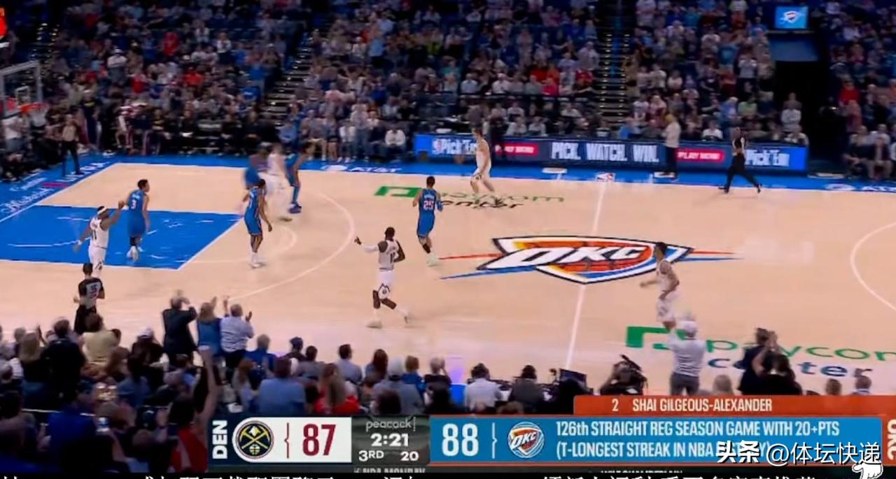 追平历史纪录!!!在掘金与雷霆的NBA常规赛中,谢伊-吉尔杰斯-亚历山大在第三节